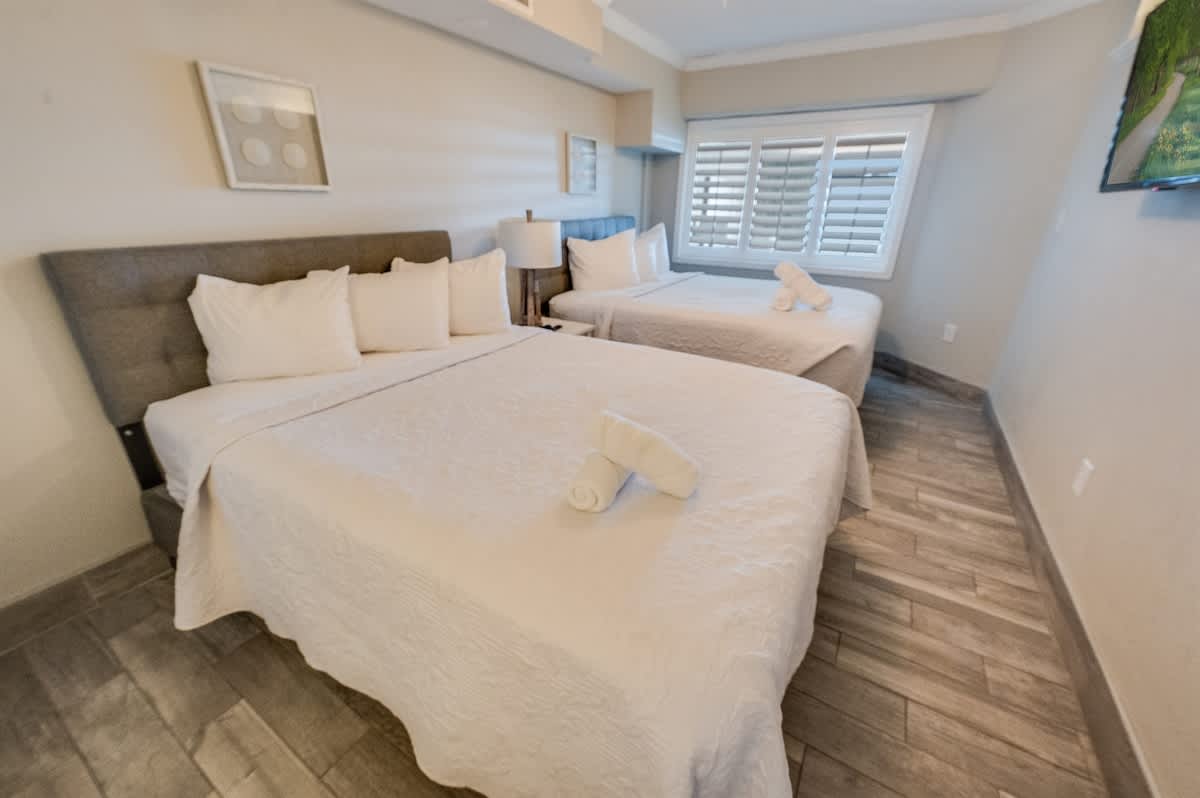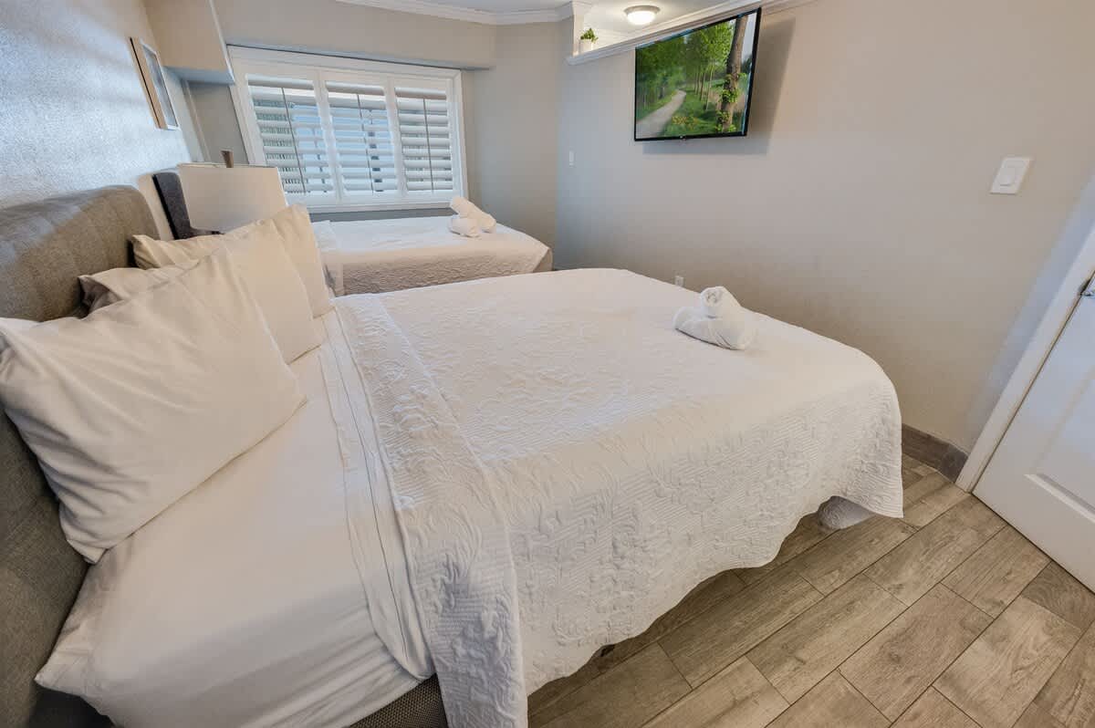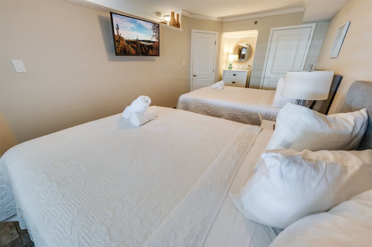 Accommodations:Two queen beds (new plush mattresses) and a sleeper sofa, sleeping up to six. Sheets provided.