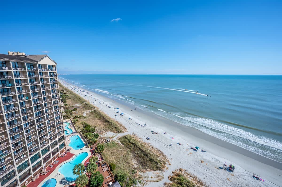The beachfront resort boasts a variety of amenities, including both indoor and outdoor whirlpools, a lazy river ride, a spacious pool deck, a Tiki bar, and social areas with oceanfront pools. There’s also an indoor pool and a children’s interactive splash and play area. And best of all, you can enjoy free Wi-Fi!