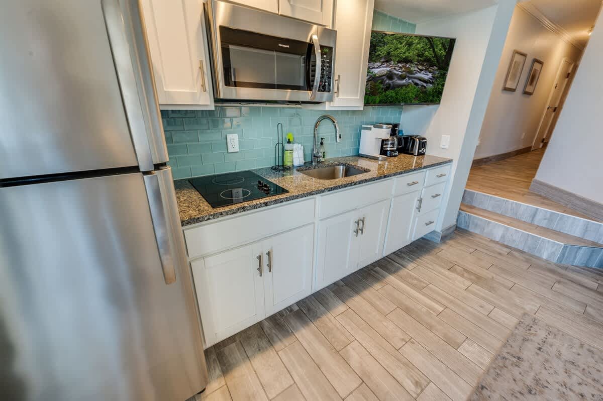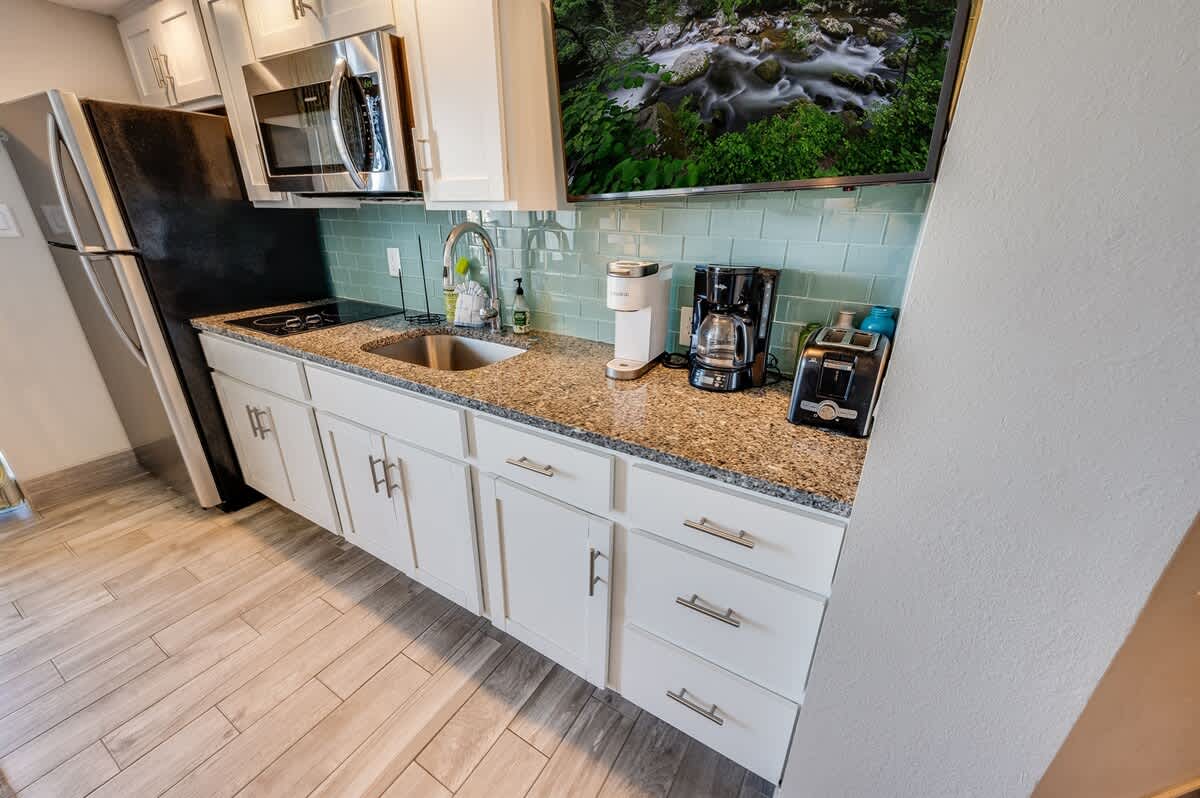 Kitchen Amenities: Full-size fridge, microwave, two-burner cooktop, and a dining table with a view.