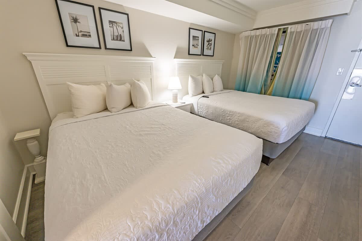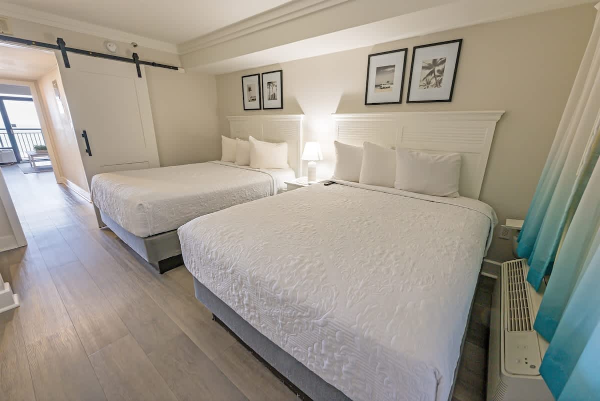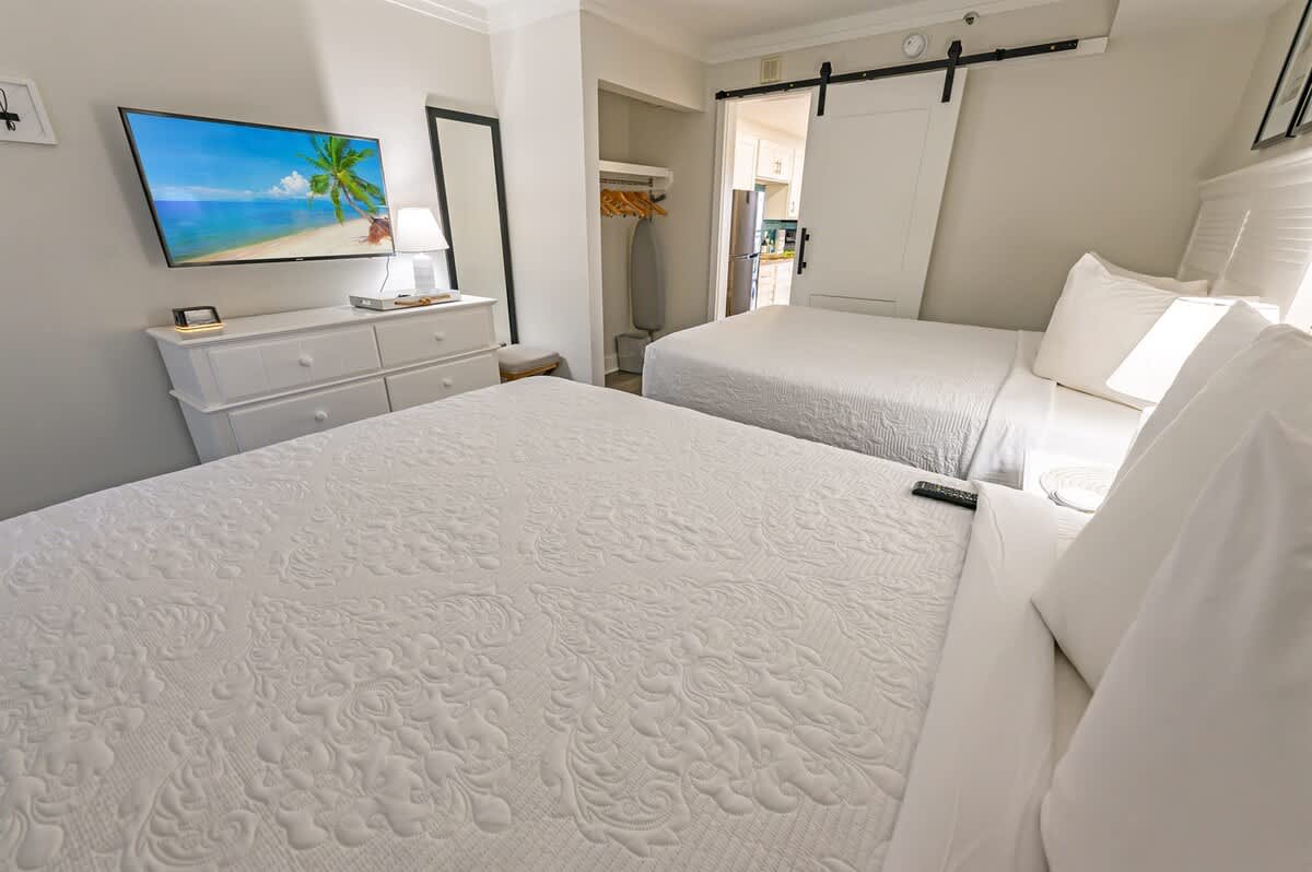 The condo sleeps up to four guests in a single bedroom furnished with two queen beds. Fresh bed linens, extra pillows and blankets, hangers, and clothing storage are provided so you can unpack and feel at ease from your first night. The layout works well for couples, friends, or small families sharing a beachfront stay.
