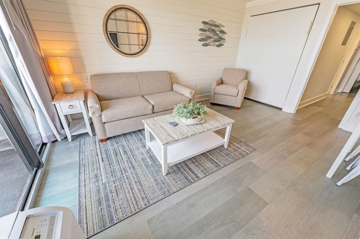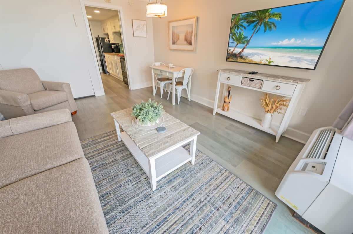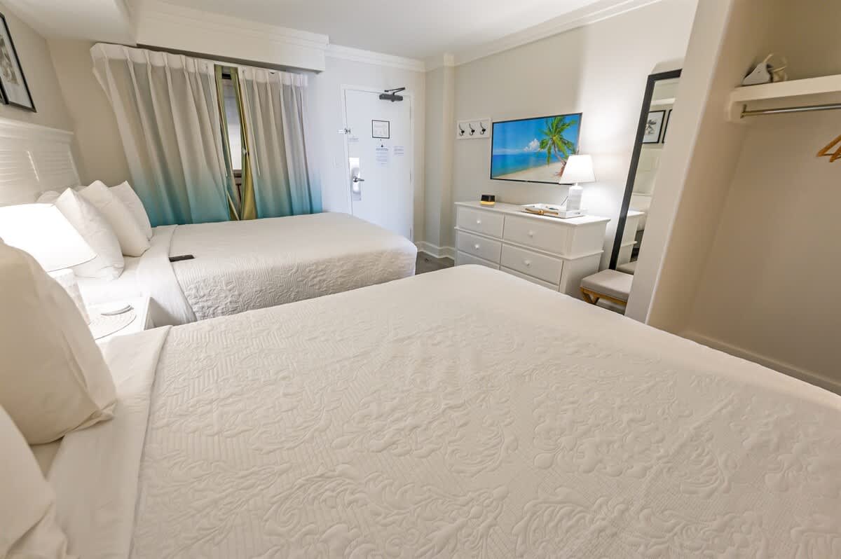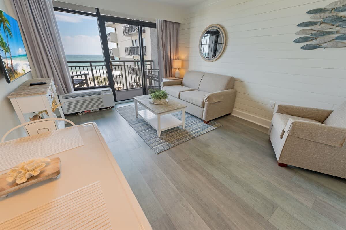 The condo sleeps up to four guests in a single bedroom furnished with two queen beds. Fresh bed linens, extra pillows and blankets, hangers, and clothing storage are provided so you can unpack and feel at ease from your first night. The layout works well for couples, friends, or small families sharing a beachfront stay.
