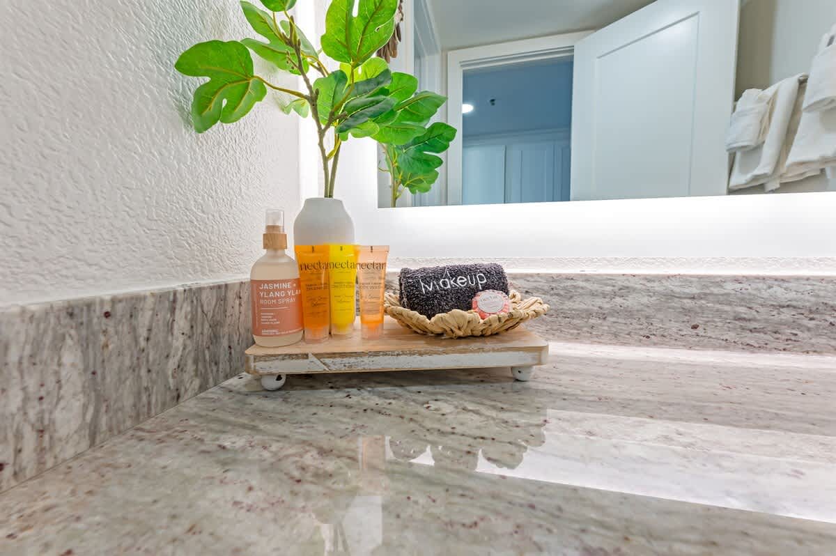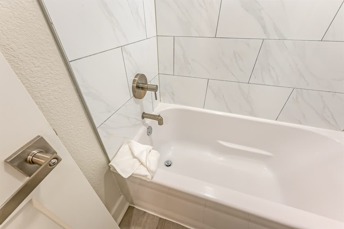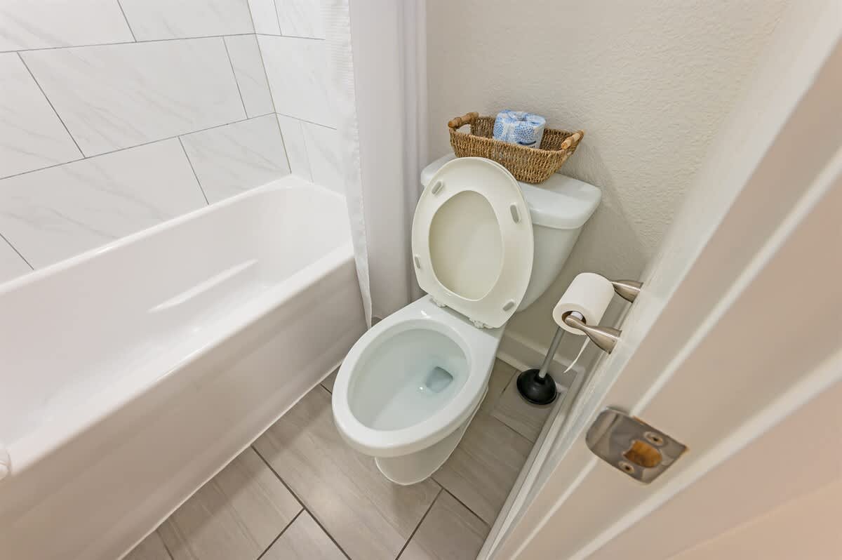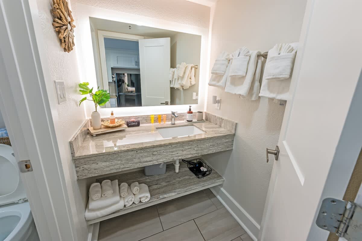 The bathroom includes a bathtub, hot water, and bathroom essentials for daily routines. An outdoor shower is also available on the property, offering a convenient place to rinse off after time at the beach or pool.