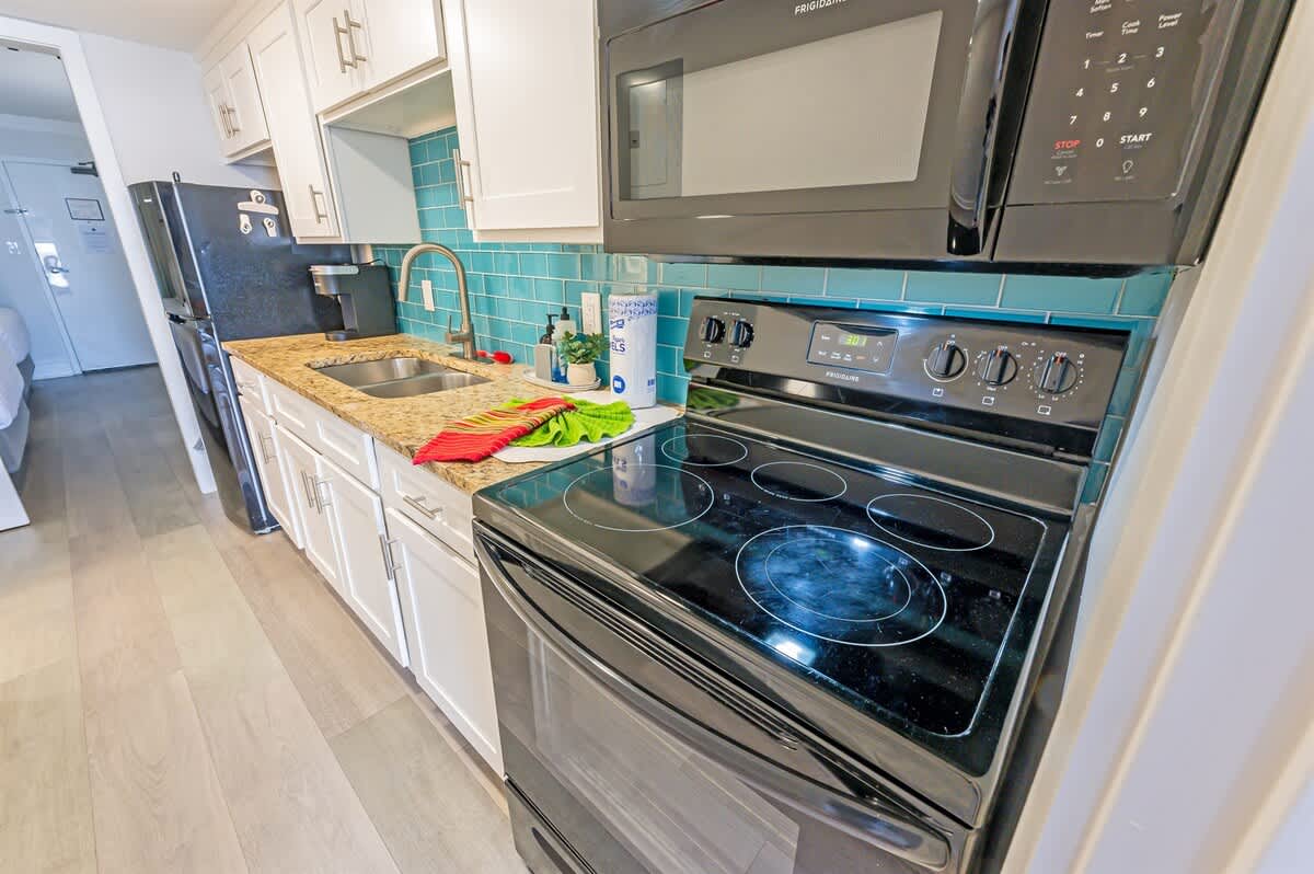 The kitchen offers the option to cook and dine in during your stay, with space to prepare meals and a dining table for gathering. Whether it’s a simple breakfast before heading out or a relaxed dinner after a day by the water, the setup supports easy in-home dining.
