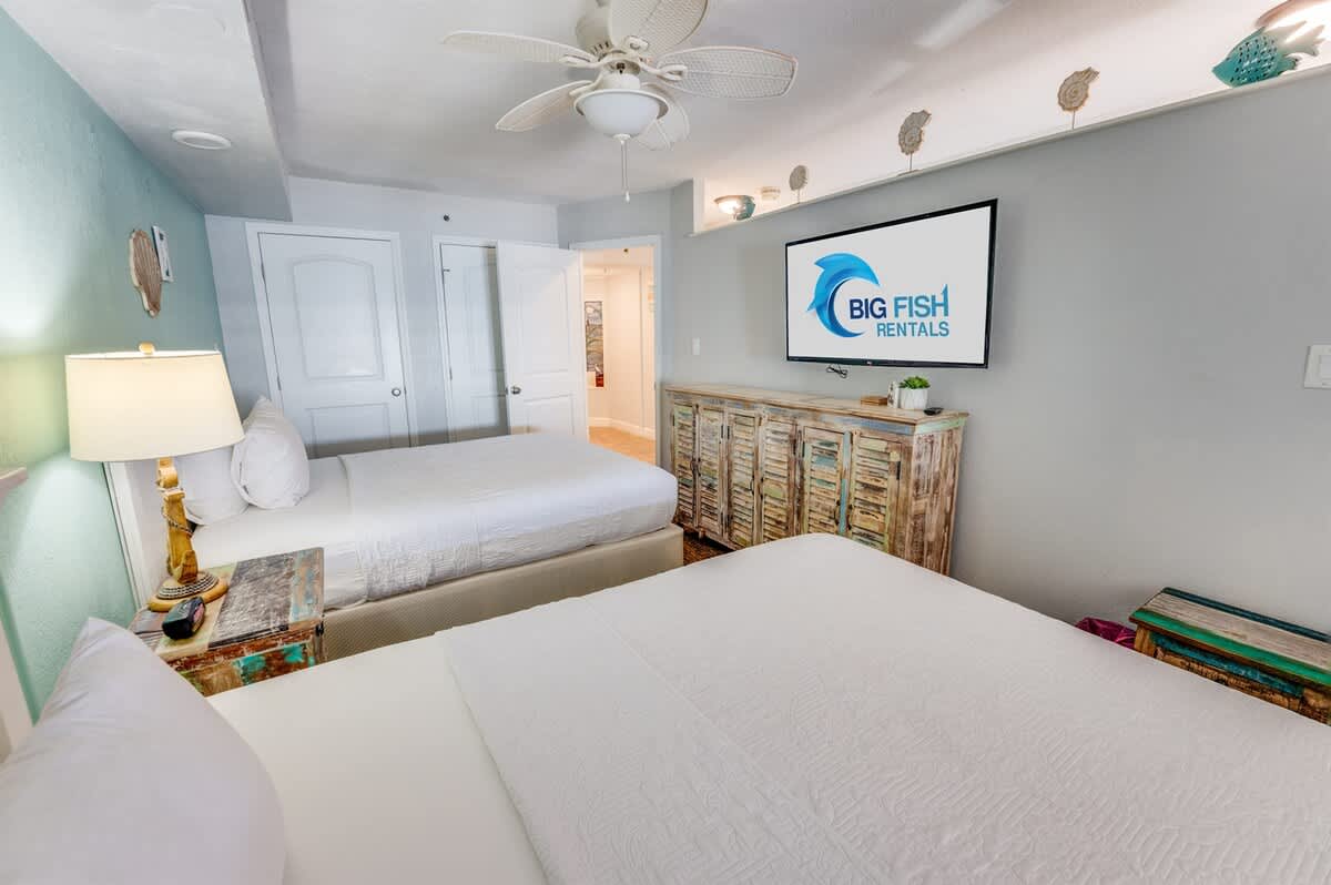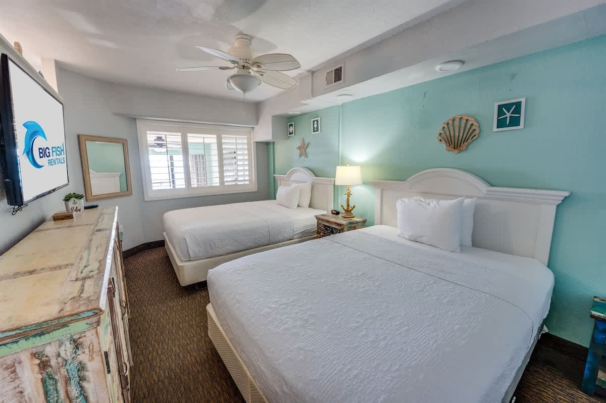 This 1 bedroom condo accommodates up to 6 guests. The bedroom includes two queen beds and ocean views, creating a comfortable retreat at the end of the day. A sleeper sofa in the living area provides additional sleeping space. Bed linens, extra pillows and blankets, and room-darkening shades are provided for a restful stay.