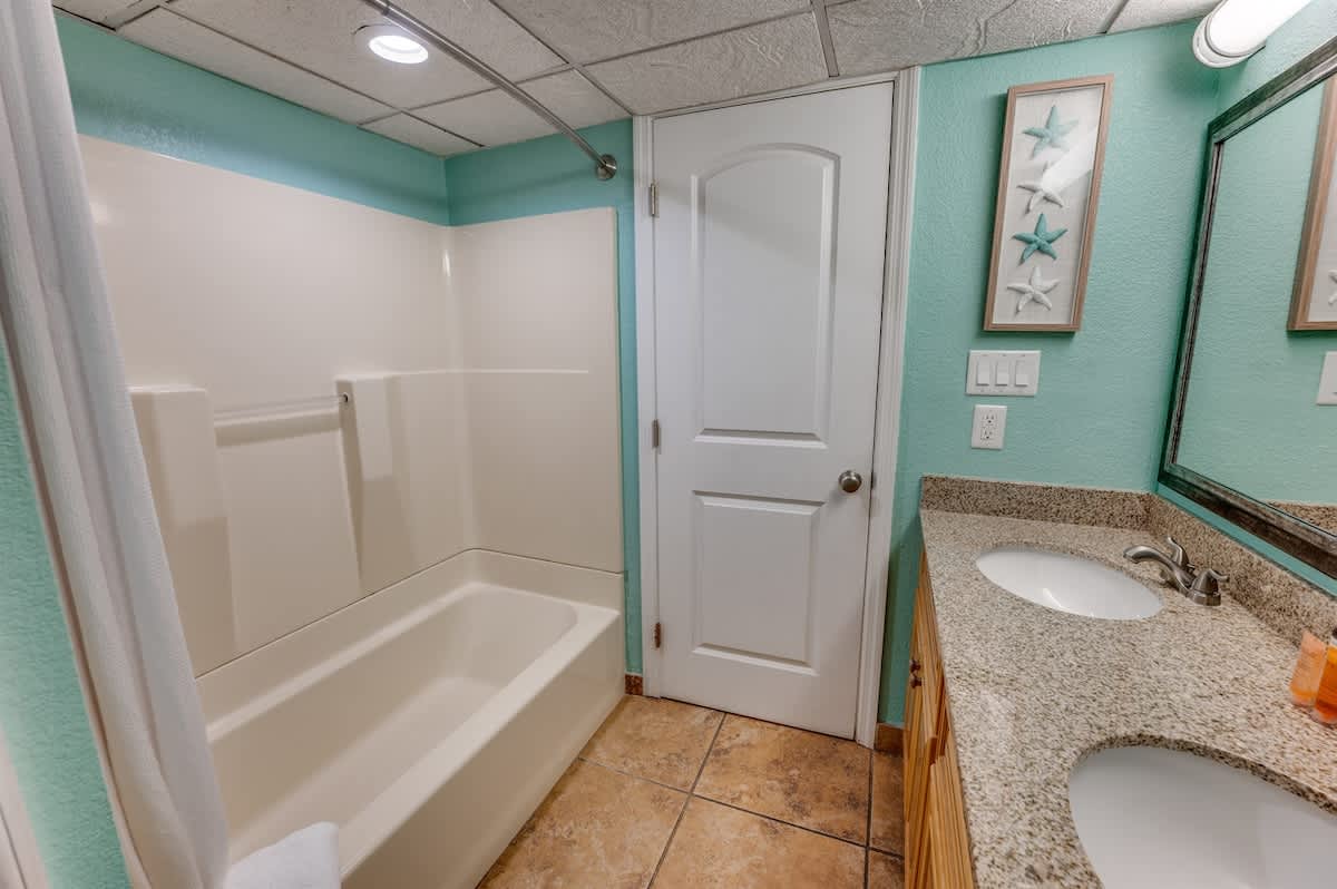 The condo includes one private bathroom with a bathtub and bathroom essentials. Towels, bed linens, and everyday necessities are provided, along with conveniences such as a hair dryer, iron, and clothing storage.