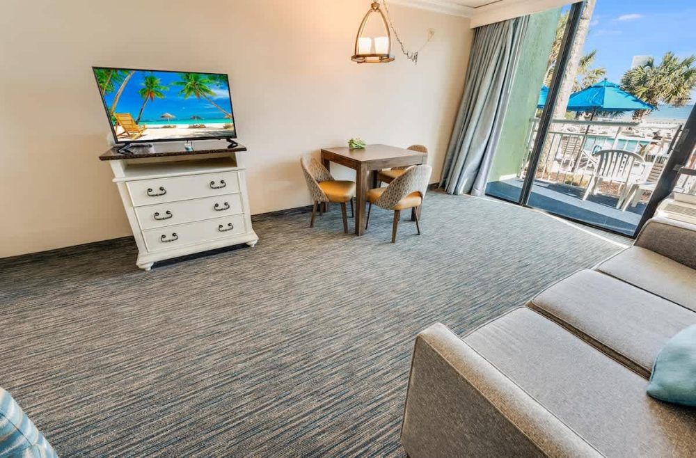 The bedroom includes two queen beds, offering a restful place to recharge after time at the beach. In the living area, a sofa bed provides additional sleeping space. Room-darkening shades support uninterrupted rest, and bed linens, extra pillows, and blankets are provided to make settling in easy.