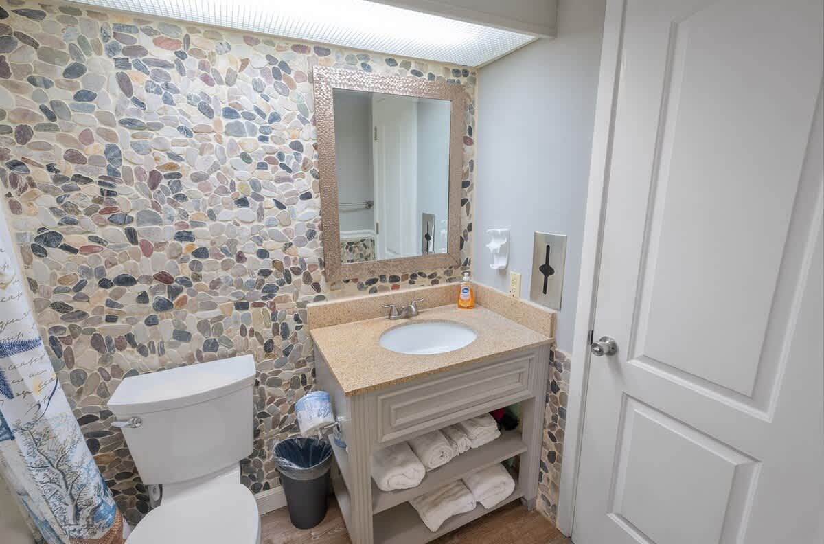 The bathroom includes a bathtub and shower, along with bathroom essentials and fresh towels. An outdoor shower is available on the property for rinsing off after time at the beach.