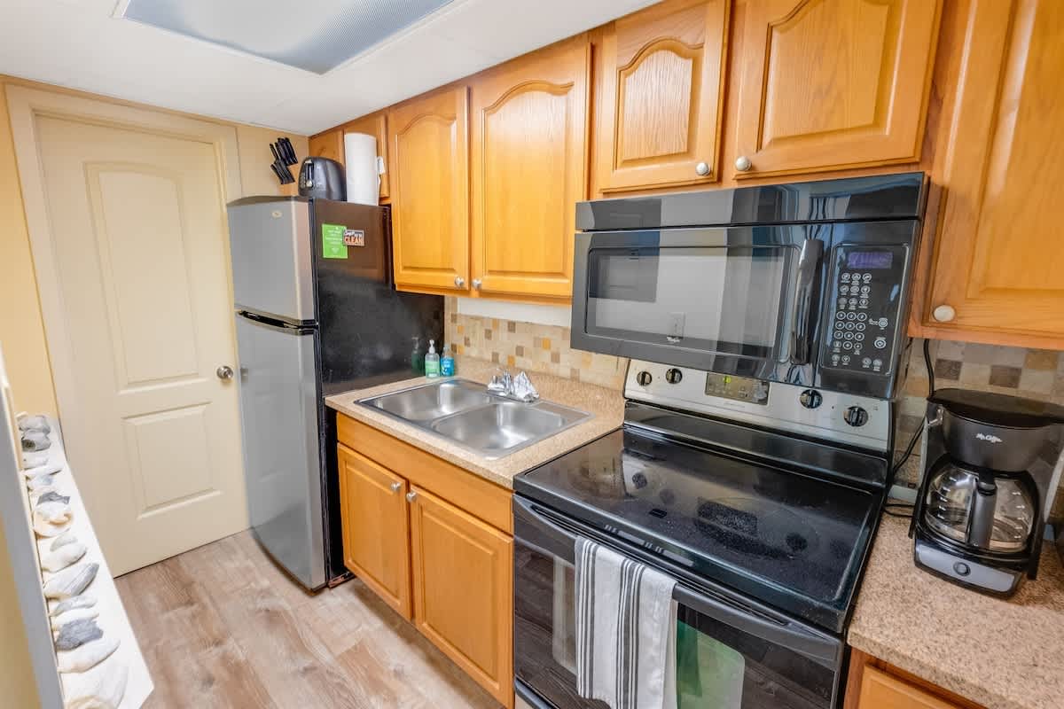 The condo includes a kitchen where you can prepare meals during your stay, along with a dining table for shared meals. Whether you are enjoying a simple breakfast before heading out or an evening meal back at the condo, the space makes it easy to dine in and unwind.