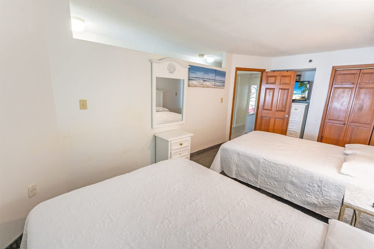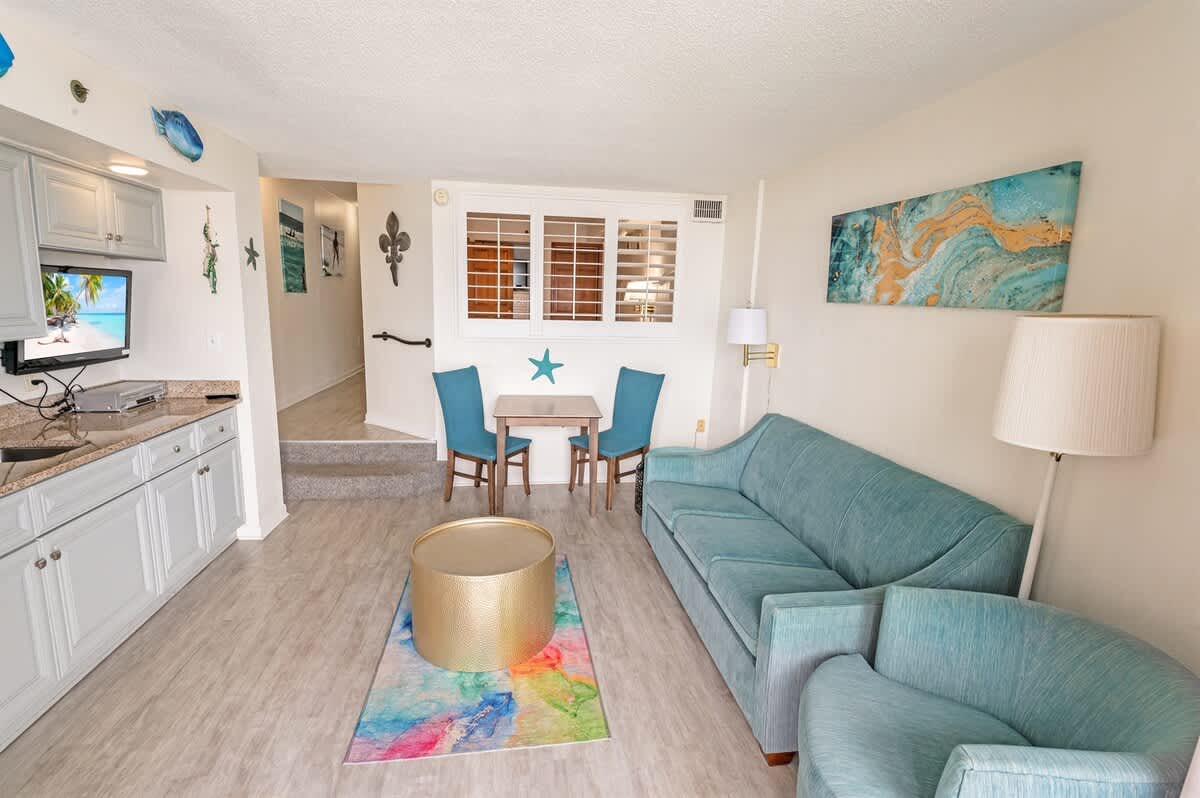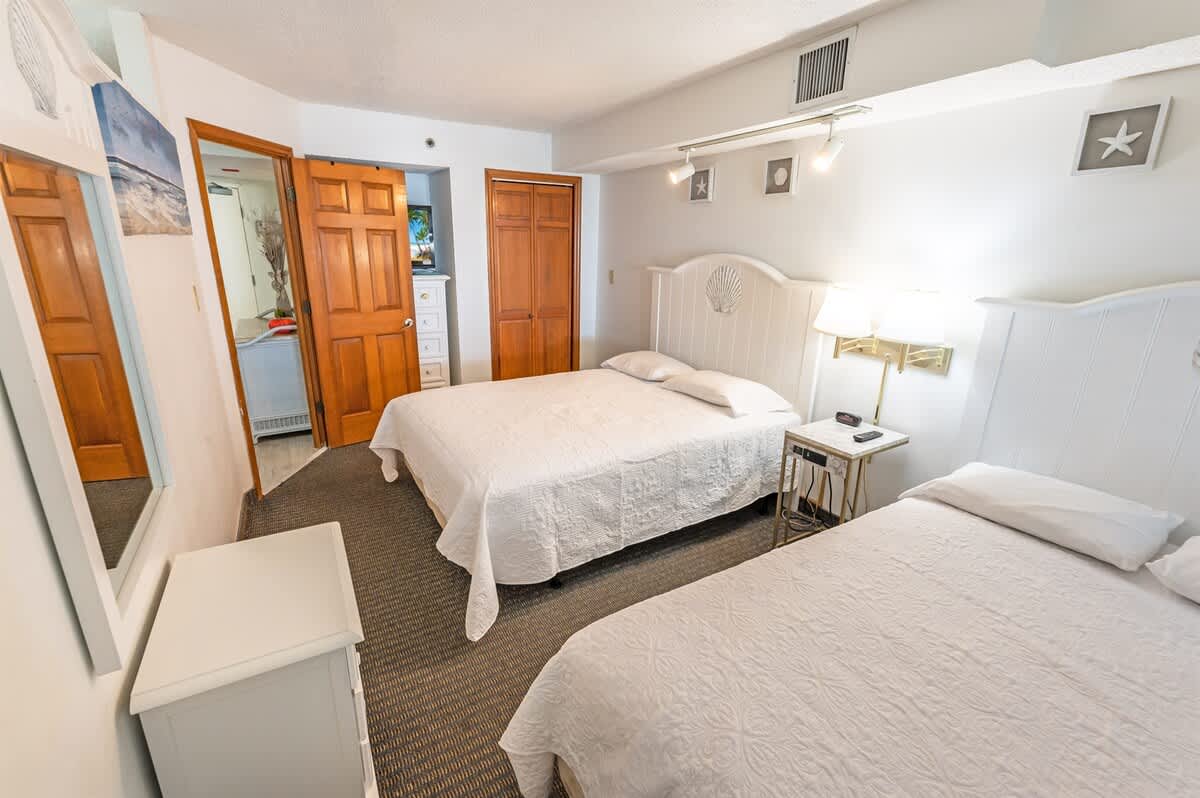 The bedroom features two queen beds, creating an adaptable setup for shared stays. In the living area, a sofa bed provides additional sleeping space without disrupting the flow of the condo. Room-darkening shades, extra pillows and blankets, and dedicated clothing storage help make evenings comfortable after days spent along the coast or exploring nearby attractions.