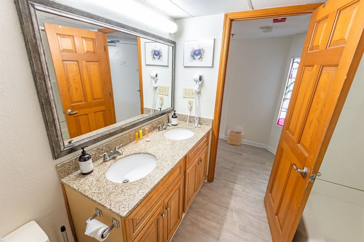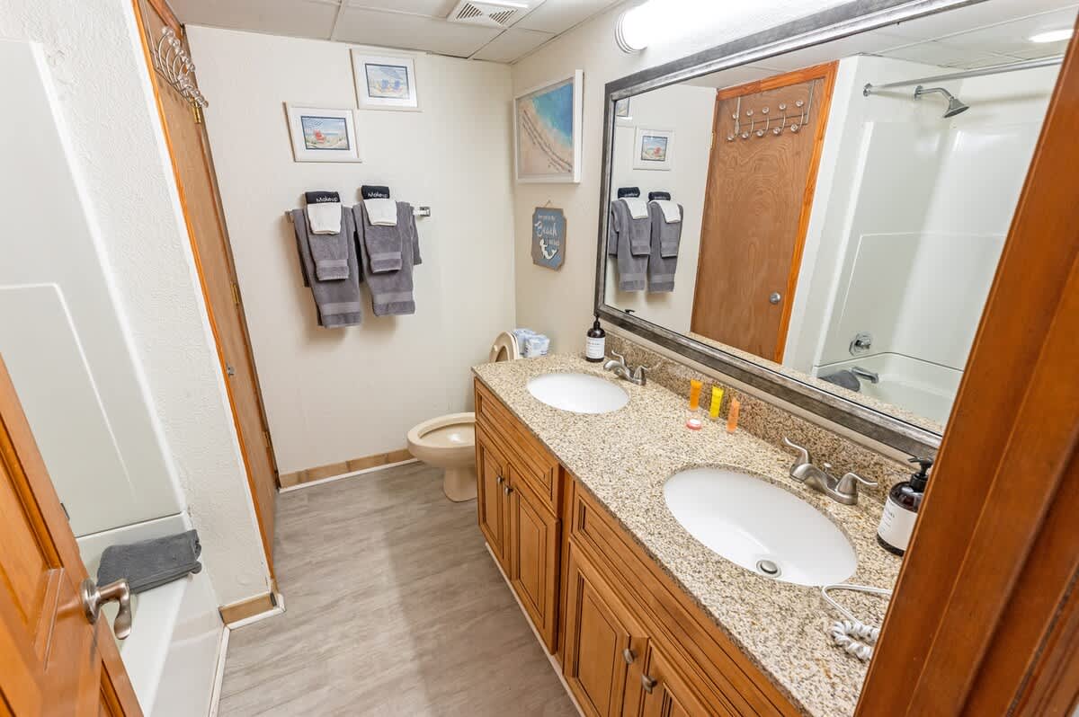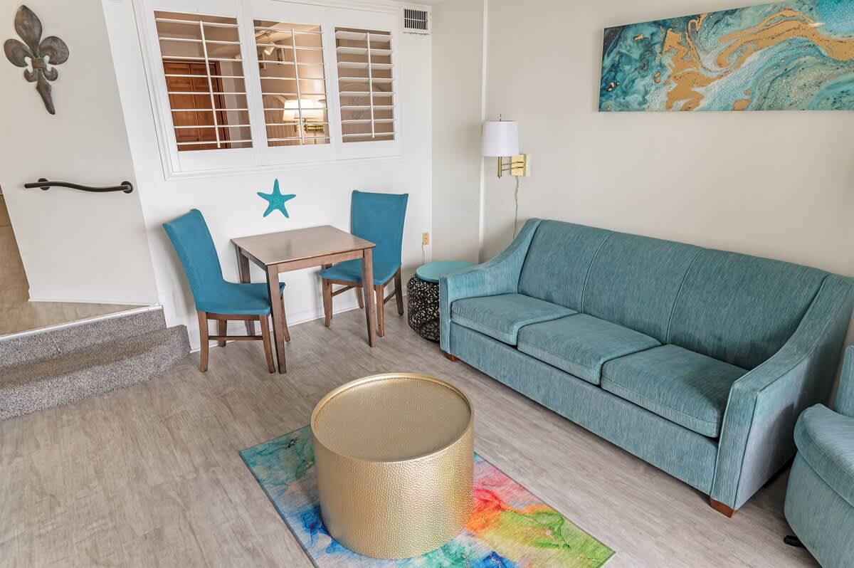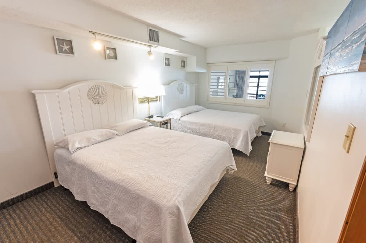 The bedroom features two queen beds, creating an adaptable setup for shared stays. In the living area, a sofa bed provides additional sleeping space without disrupting the flow of the condo. Room-darkening shades, extra pillows and blankets, and dedicated clothing storage help make evenings comfortable after days spent along the coast or exploring nearby attractions.
