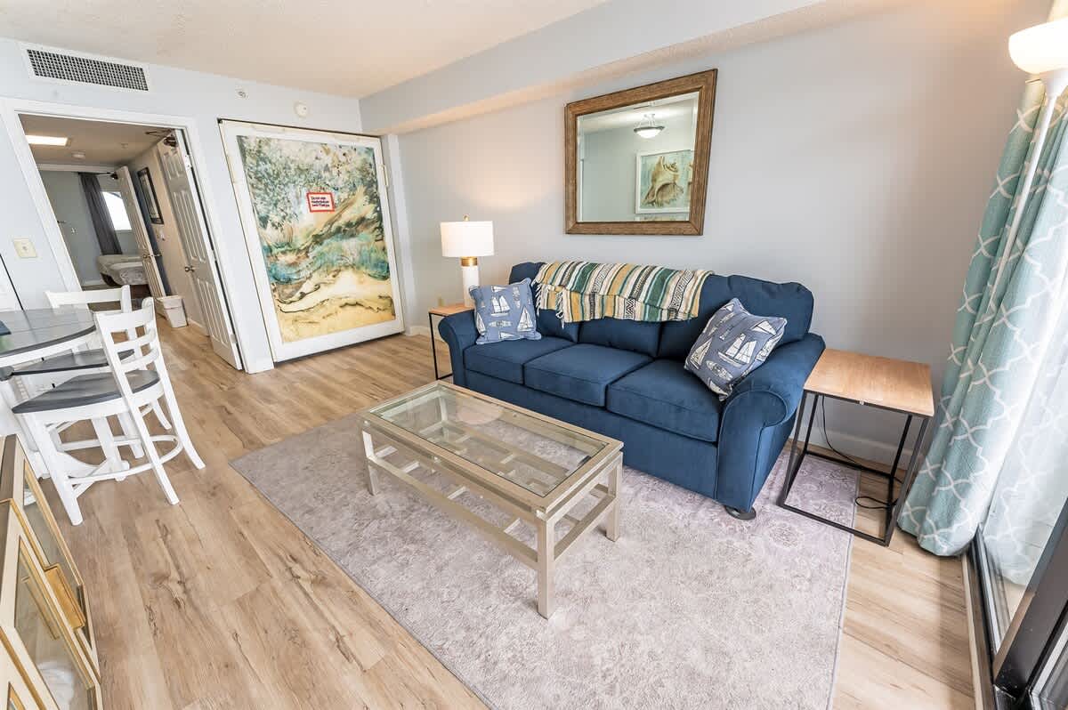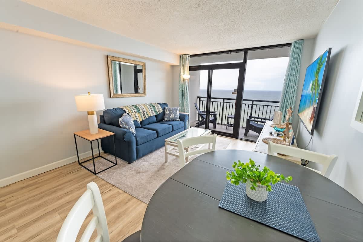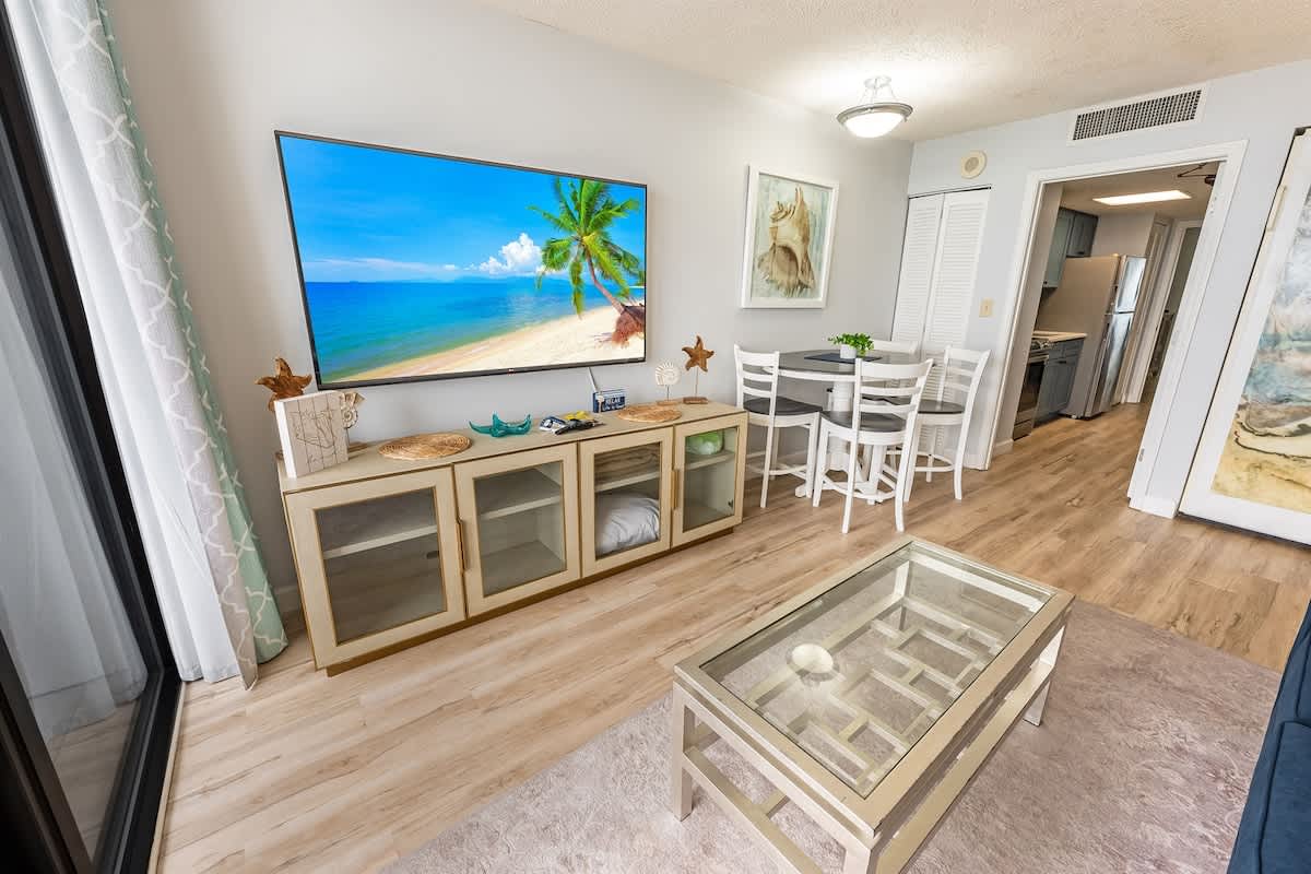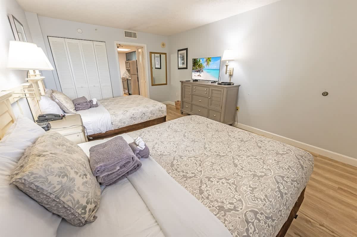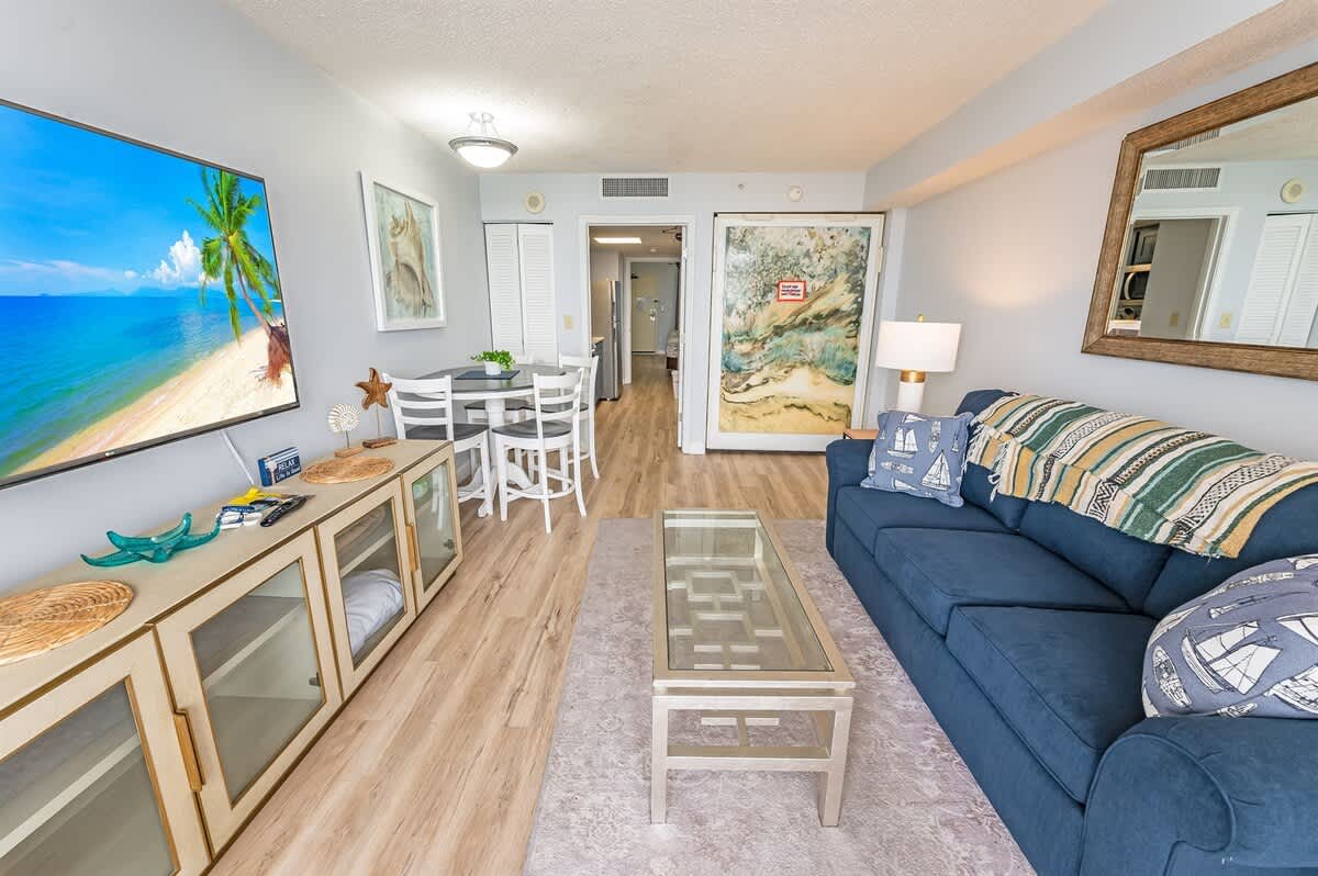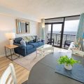 Once you enter the bedroom area (with two queen beds) through the entryway, you will pass through the kitchen area with full-sized appliances and into the living room, which leads to the balcony. The balcony offers amazing ocean views and is the perfect setting for enjoying your morning coffee or evening cocktails. The unit features a full-sized cooktop, microwave, and fridge for your convenience.