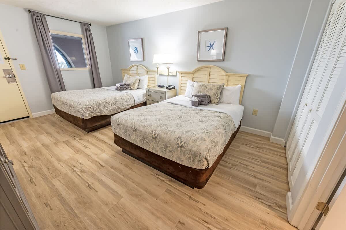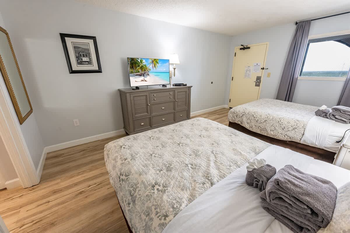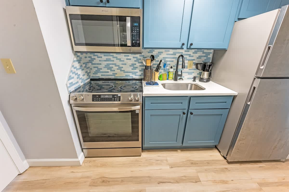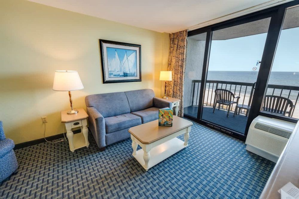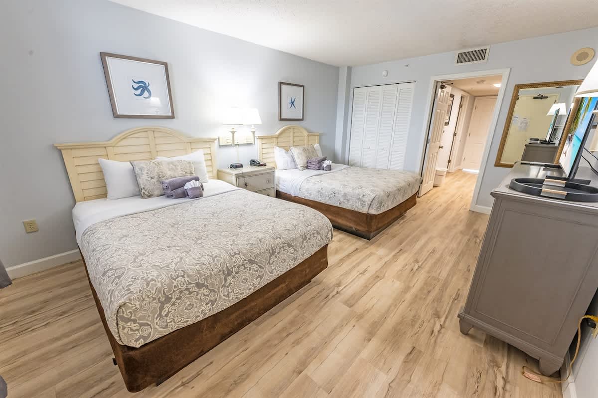 Once you enter the bedroom area (with two queen beds) through the entryway, you will pass through the kitchen area with full-sized appliances and into the living room, which leads to the balcony. The balcony offers amazing ocean views and is the perfect setting for enjoying your morning coffee or evening cocktails. The unit features a full-sized cooktop, microwave, and fridge for your convenience.