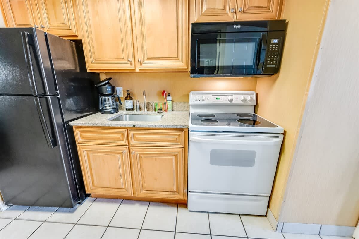 Once you enter the bedroom area, you’ll pass through the kitchen and into the living room, which leads to the balcony. The balcony has amazing ocean views, which are the perfect setting for your morning coffee or evening cocktails. The unit has a full kitchen with a full-sized cooktop, microwave, and fridge.
