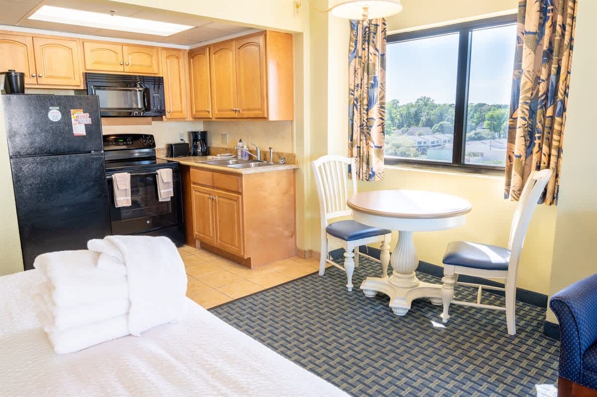 * Kitchen table for enjoying meals with a view (note: the refrigerator is mini-fridge size)