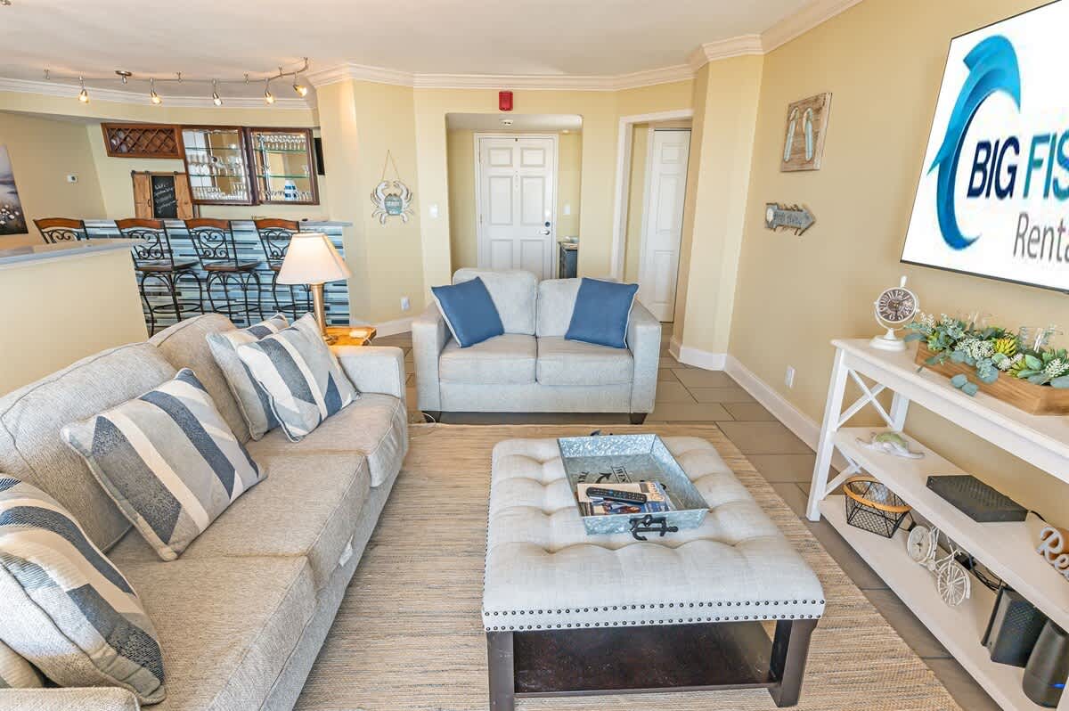 This property boasts fantastic views of the ocean from the living area, both bedrooms, and terraces! Two queens and one king make up this condo. Found in the upscale Maisons Sur Mer neighborhood of Myrtle Beach, South Carolina, this resort has it all! The seaside property has LCD TVs, a microwave oven, and separate bathrooms. Oceanfront pool with private balconies and pools! WIFI FOR FREE! As much as we love our apartment, we hope you do too!