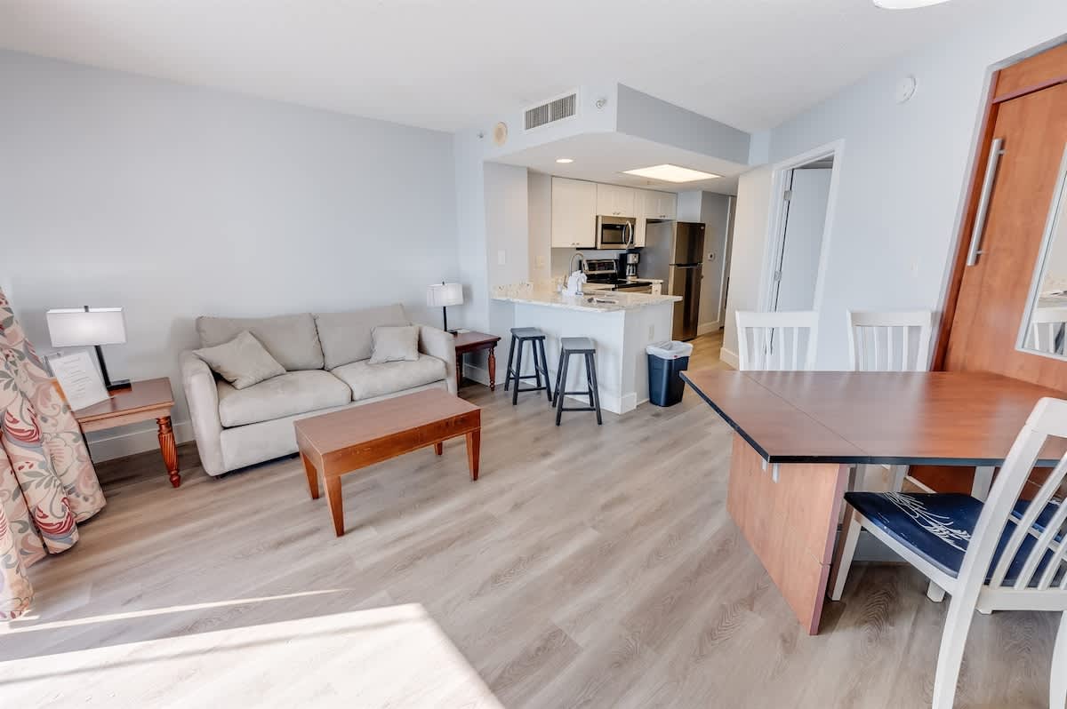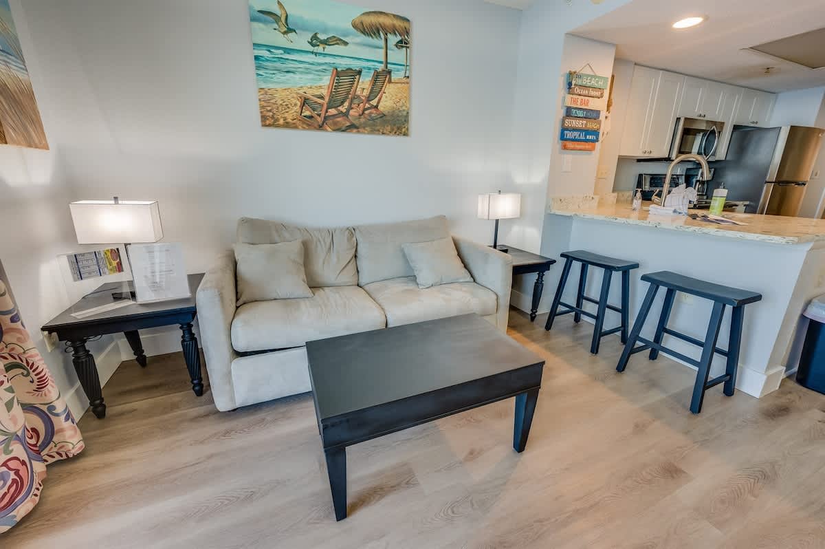 This one-bedroom condo is located in Roxanne Towers Resort and has an AMAZING DIRECT oceanfront view from the balcony and living room! This condo can sleep up to 6 people! Bring your friends or extended family on this vacation with you! The kitchen is updated with full-sized appliances, including a dishwasher, and is furnished with cookware and dishes. Everything you need to make this vacation more convenient and restful.