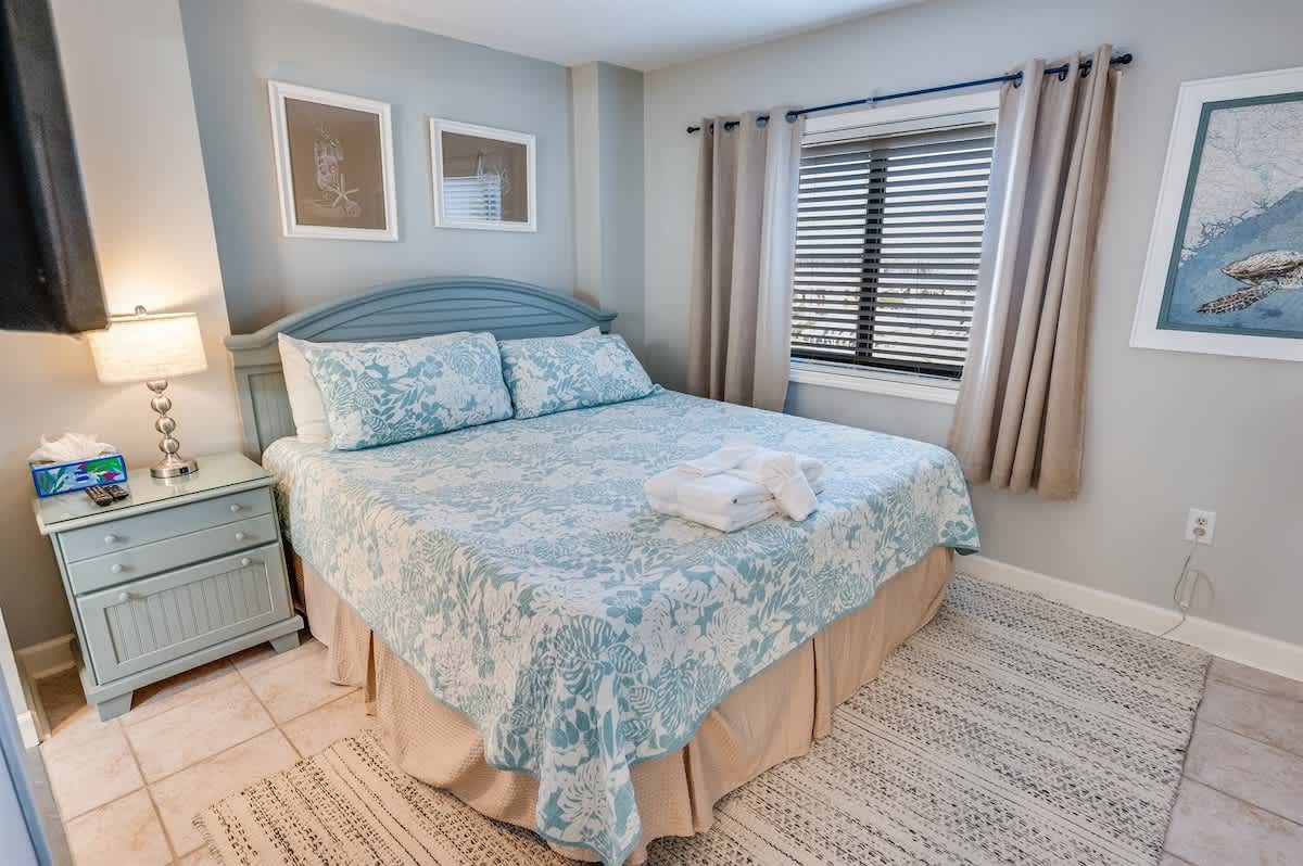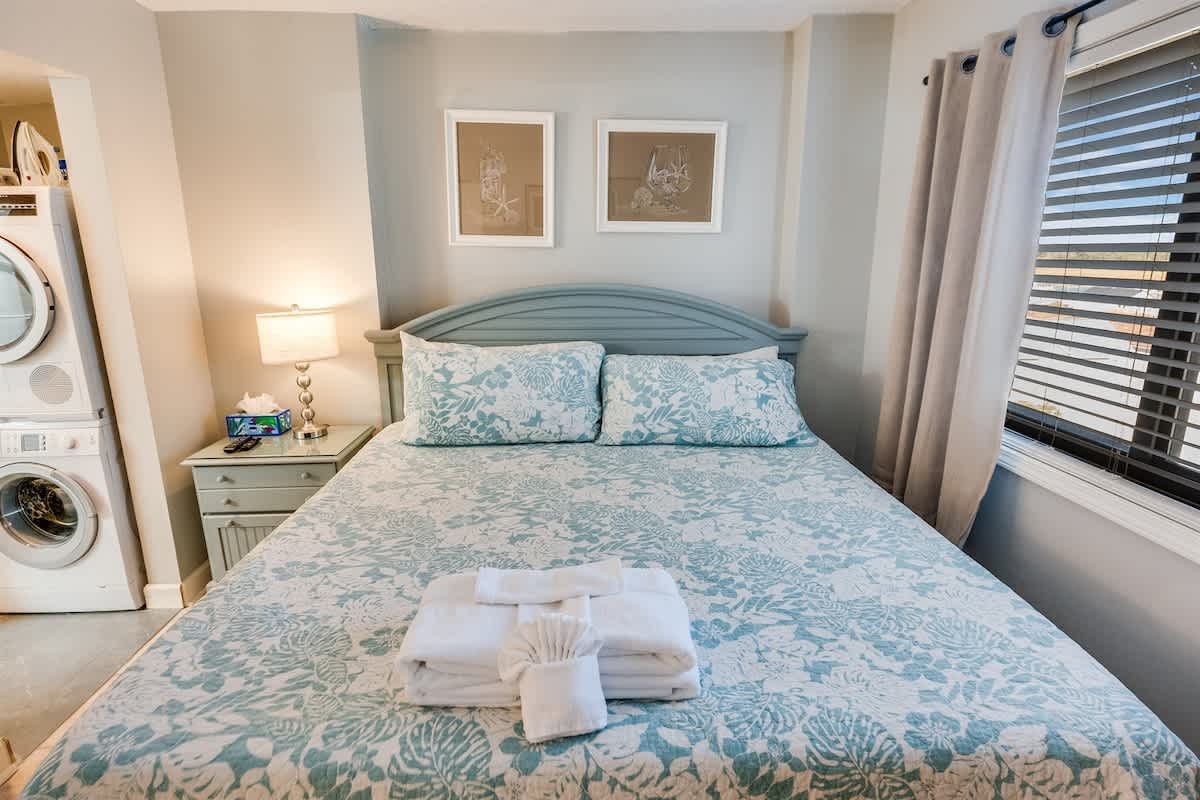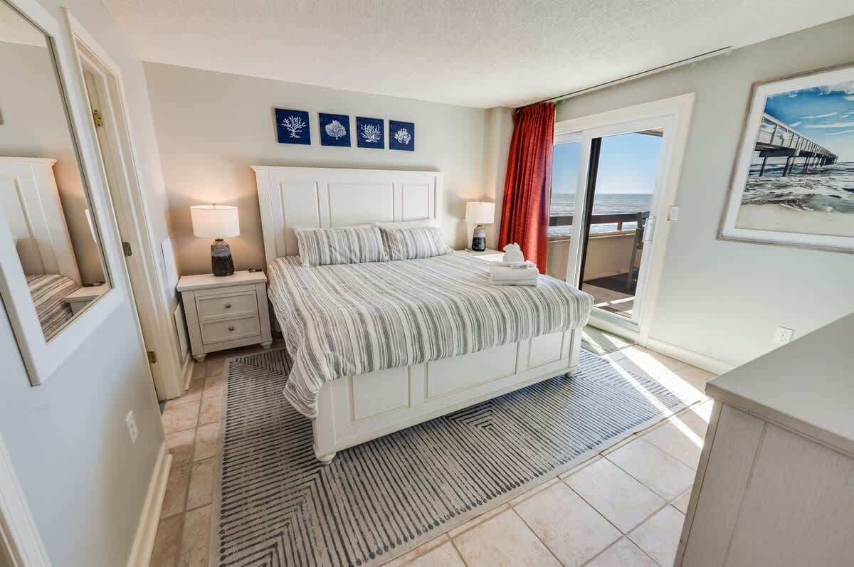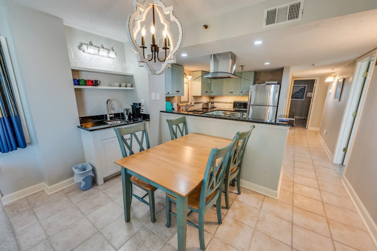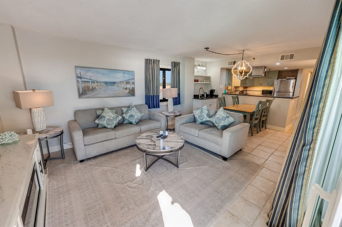 The condo accommodates up to eight guests with two bedrooms and two beds. The main bedroom includes a king bed, while the second bedroom offers one queen bed. A sleeper sofa in the living room provides added flexibility for larger groups. Fresh linens, extra pillows, and blankets ensure each guest drifts off in comfort after a day of surf and sand.