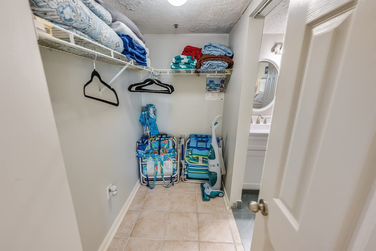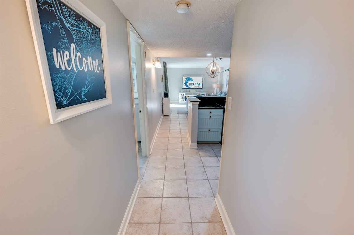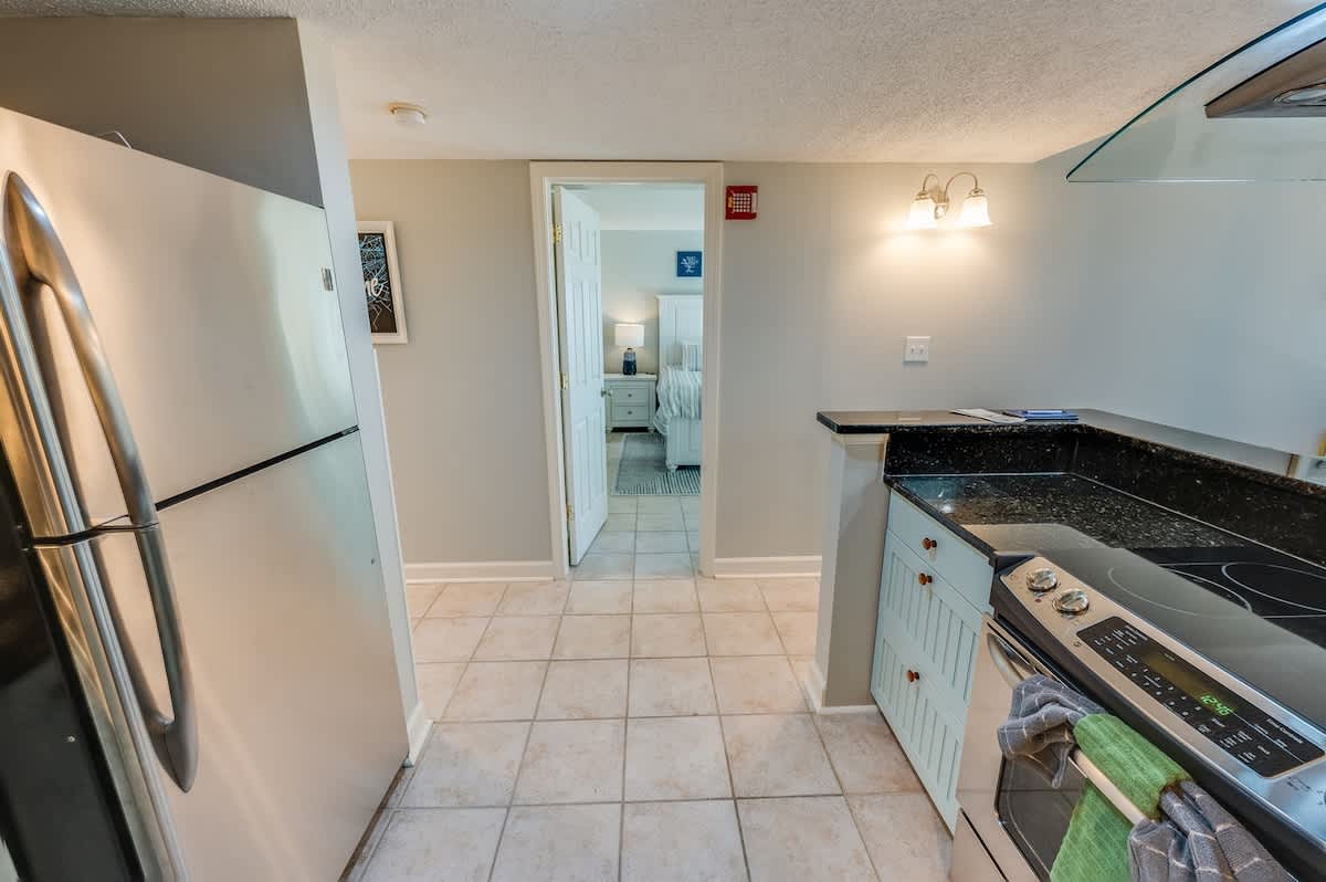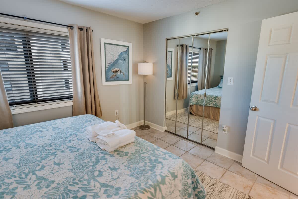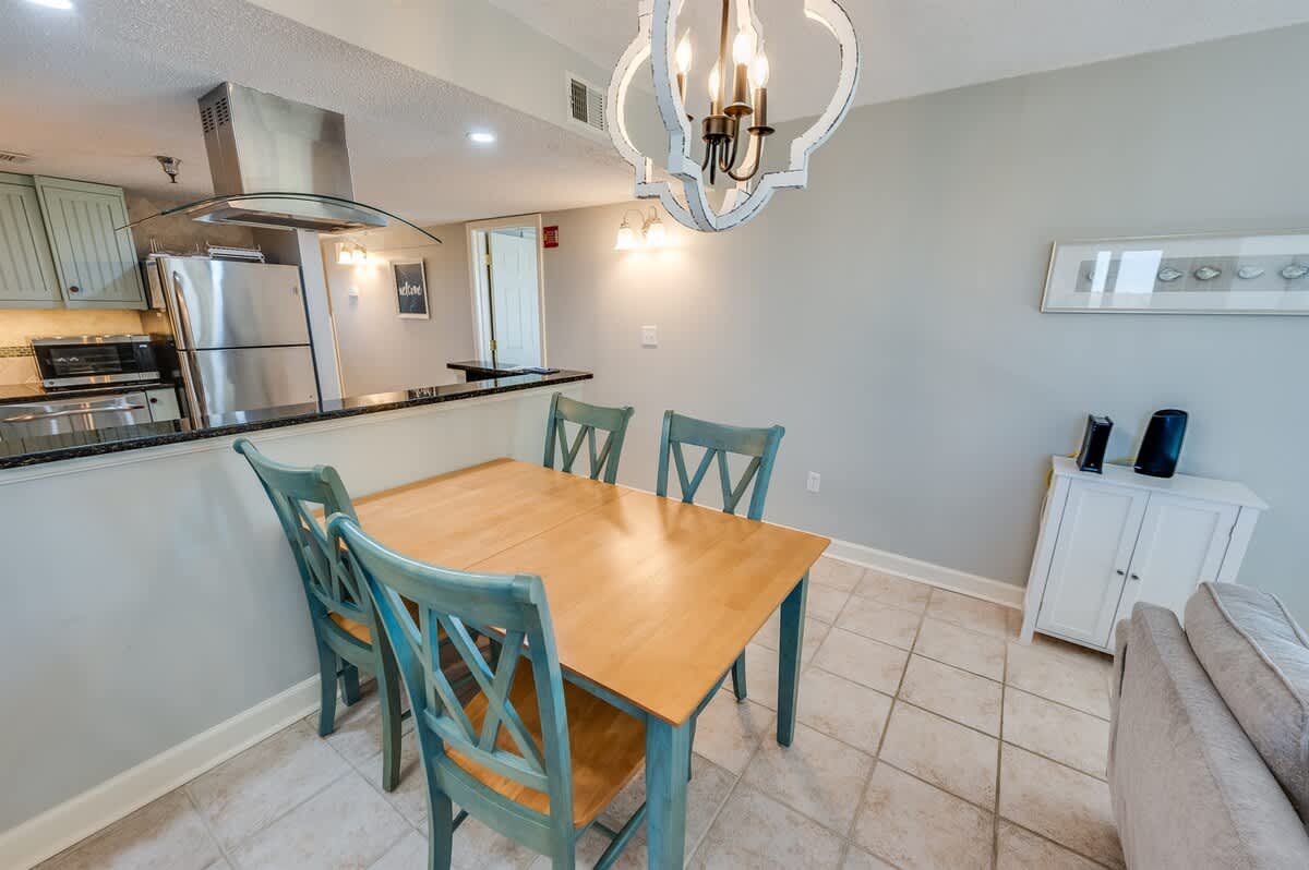 The condo accommodates up to eight guests with two bedrooms and two beds. The main bedroom includes a king bed, while the second bedroom offers one queen bed. A sleeper sofa in the living room provides added flexibility for larger groups. Fresh linens, extra pillows, and blankets ensure each guest drifts off in comfort after a day of surf and sand.