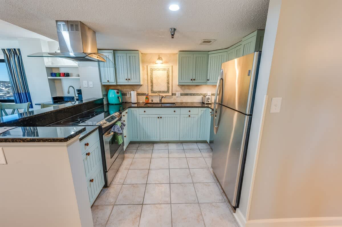 Inside, unwind in the spacious living area featuring comfortable seating and a TV for relaxed evenings in. The fully equipped kitchen includes a refrigerator, microwave, coffee maker, toaster, and all the essentials for easy meal preparation. Enjoy meals together at the dining table or take them out onto the balcony to dine with the ocean as your backdrop. The condo also includes air conditioning, heating, Wi-Fi, and an iron for added convenience.
