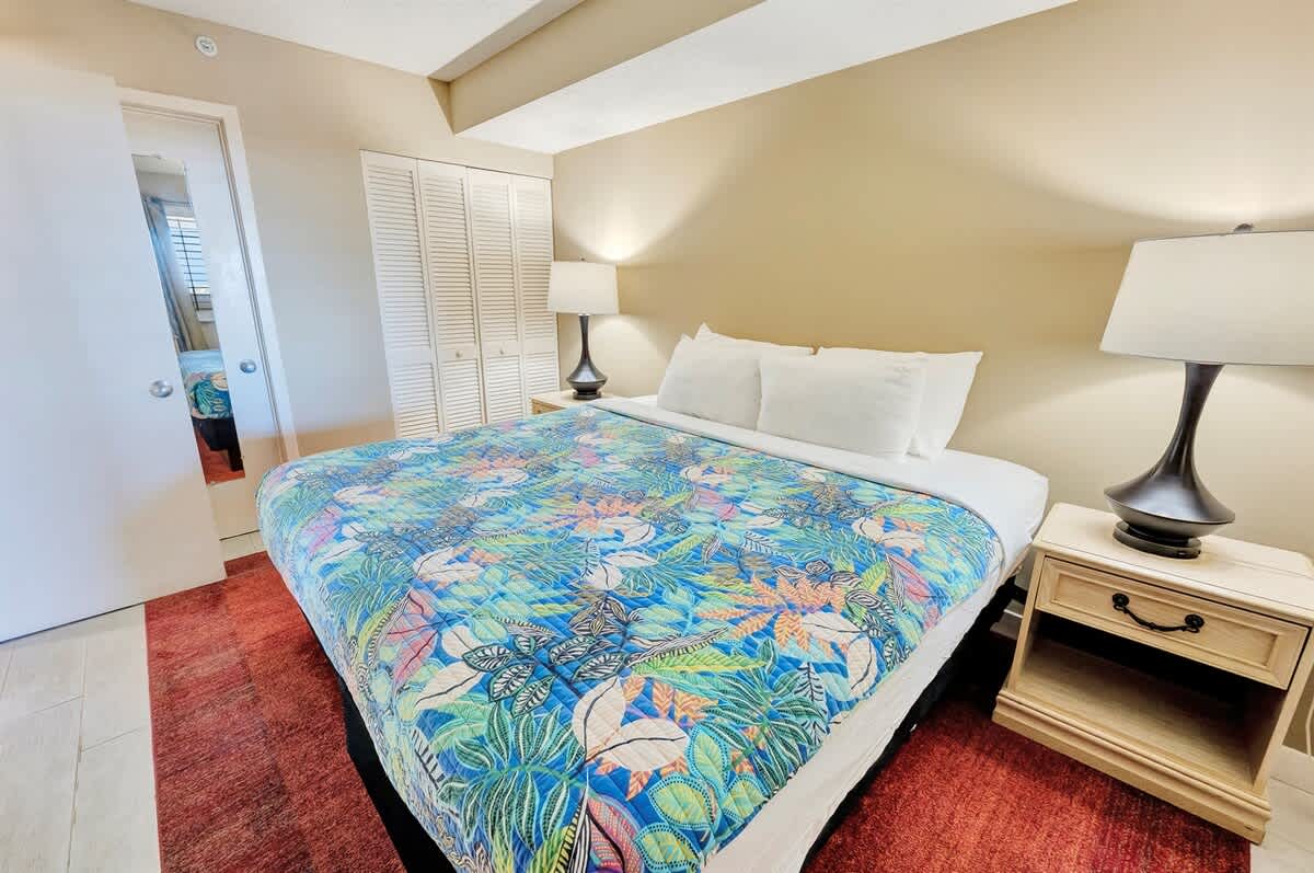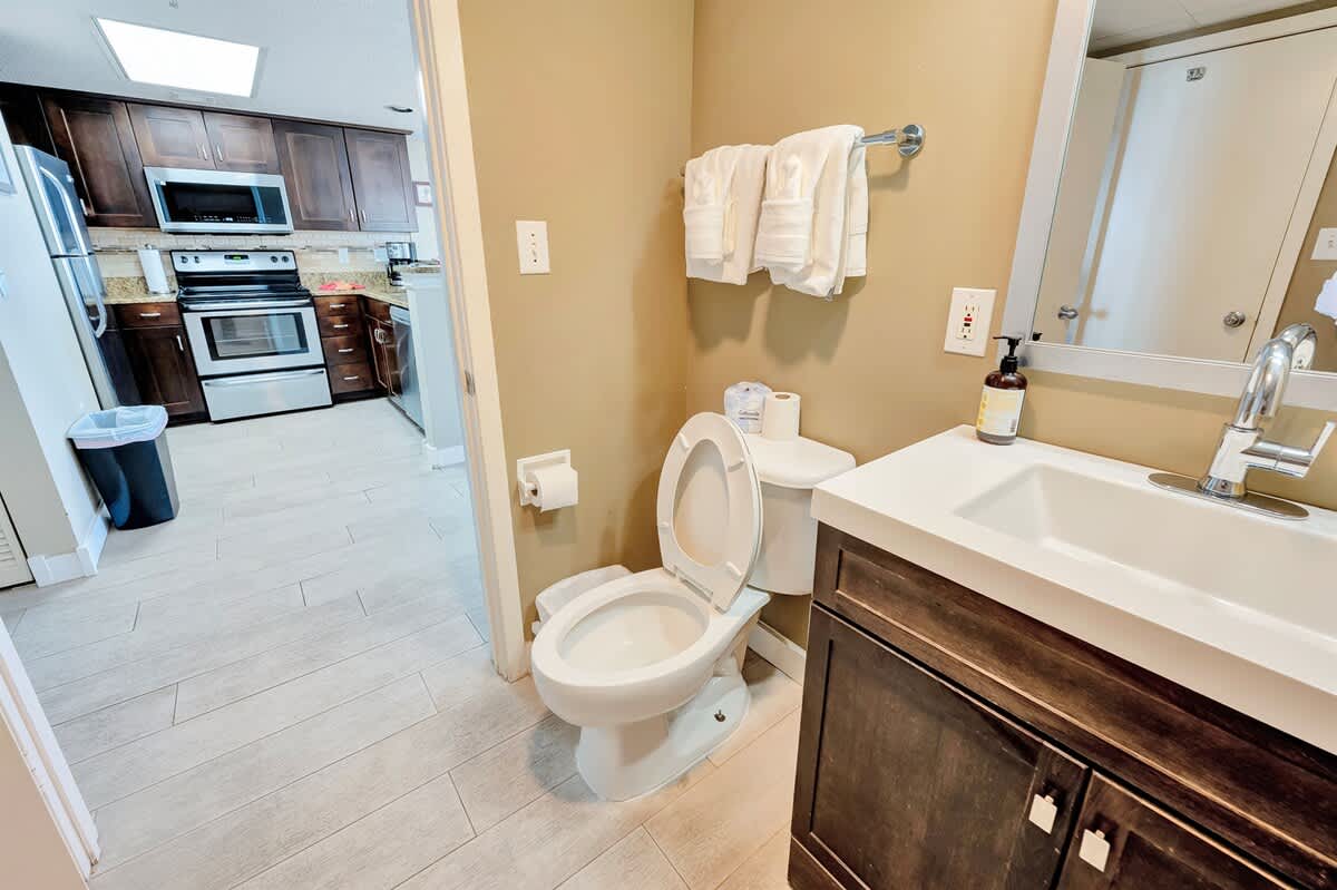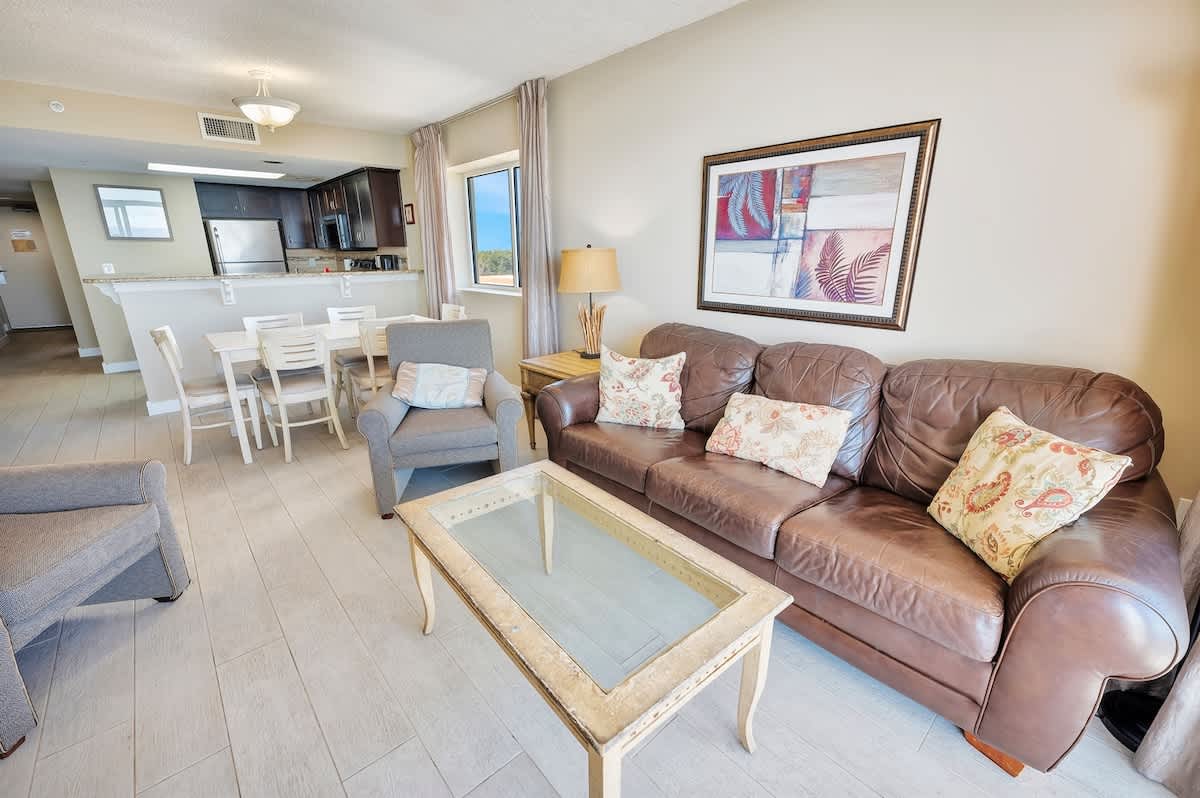 Three bedrooms comfortably accommodate your group. Two bedrooms feature king beds, including one positioned to face the ocean, while the third bedroom offers a queen bed. A sofa bed in the living area allows the condo to sleep up to eight guests. Room-darkening shades, bed linens, and extra pillows and blankets help everyone unwind at the end of the day. Two full bathrooms make mornings and evenings easy to manage.