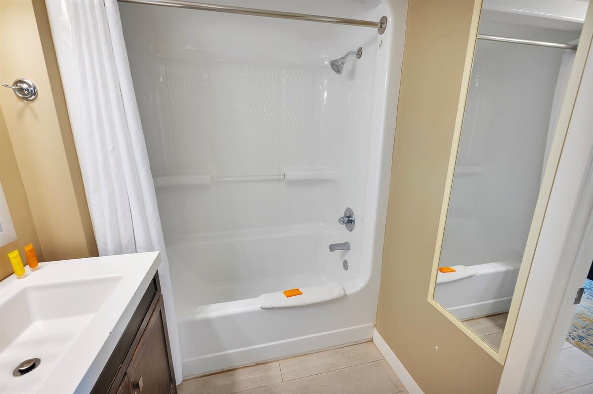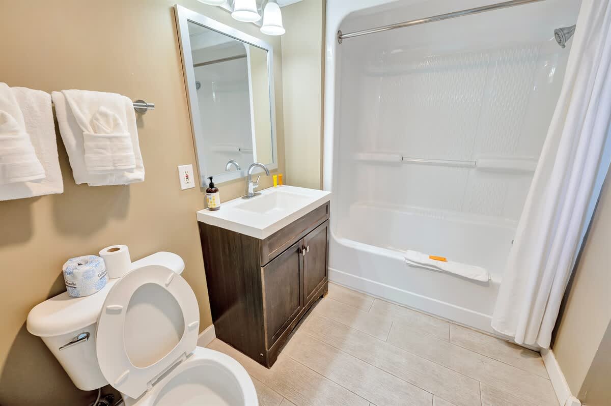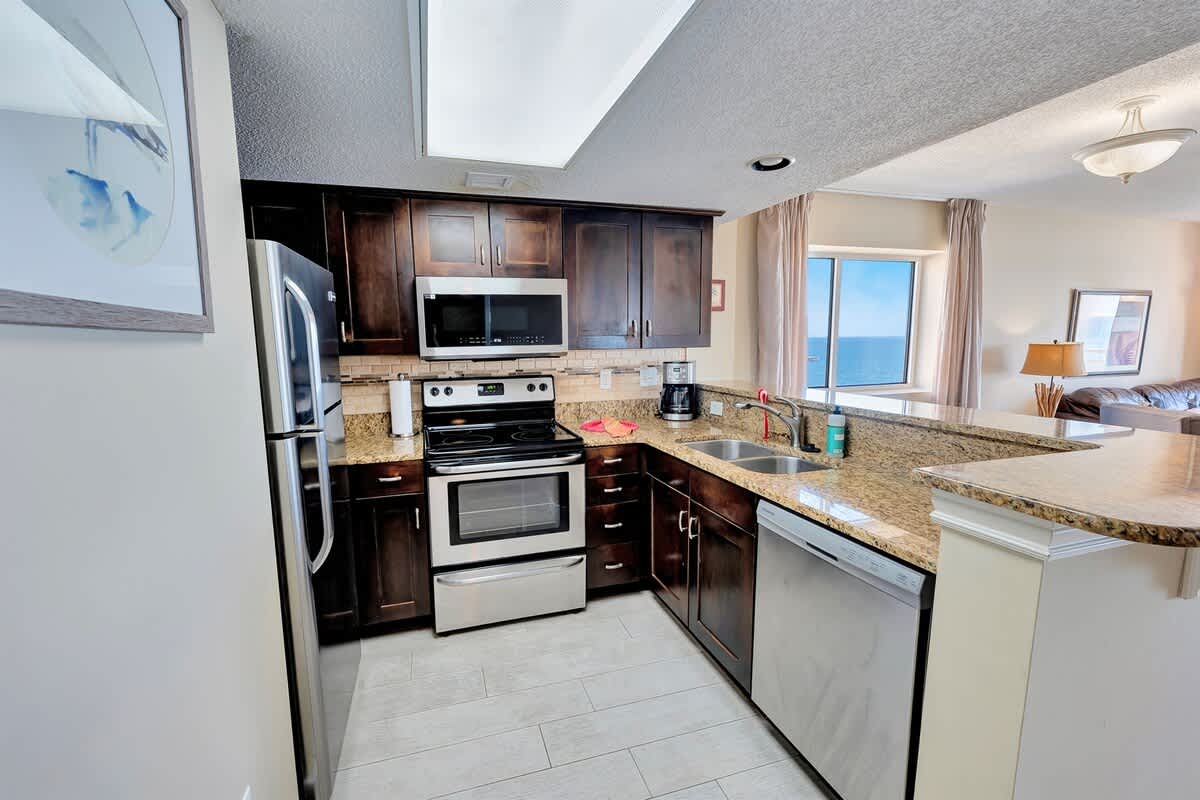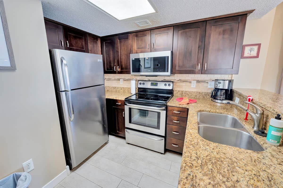 Three bedrooms comfortably accommodate your group. Two bedrooms feature king beds, including one positioned to face the ocean, while the third bedroom offers a queen bed. A sofa bed in the living area allows the condo to sleep up to eight guests. Room-darkening shades, bed linens, and extra pillows and blankets help everyone unwind at the end of the day. Two full bathrooms make mornings and evenings easy to manage.