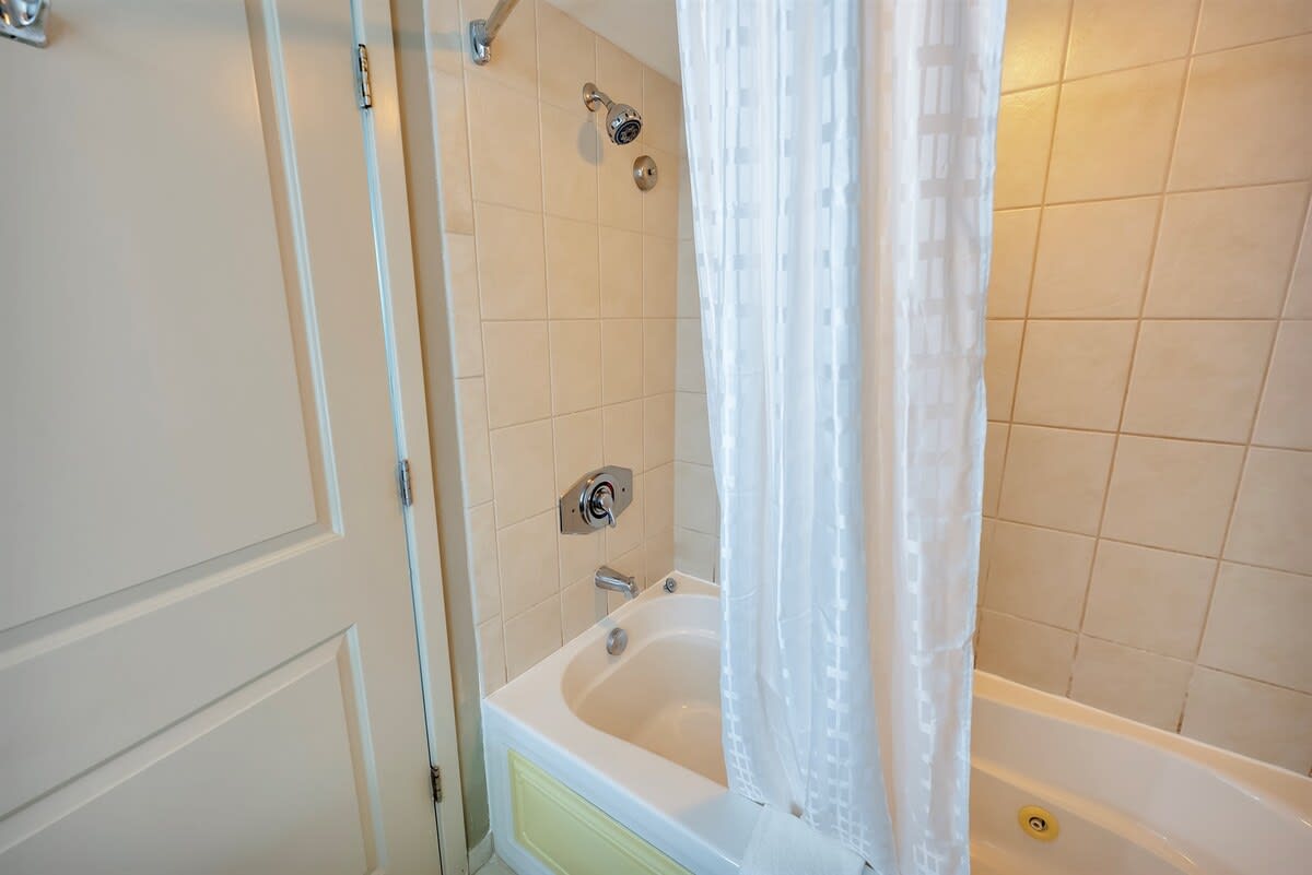 The condo sleeps up to six guests across two private bedrooms and additional sleeping space in the living area. The main bedroom features a king bed positioned to take in ocean views and an ensuite bathroom with a bathtub designed for relaxing after a day by the water. The second bedroom offers a queen bed and convenient access to a full bathroom, while a sofa bed in the living area accommodates extra guests.