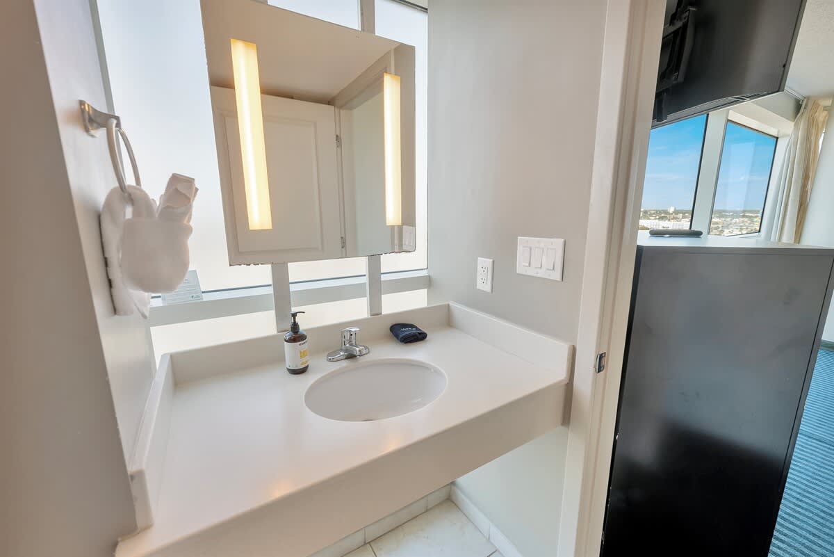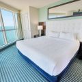 Set on the 16th floor of Oceans One Resort, this entire condo places you right on the beachfront with sweeping ocean, beach, pool, resort, and city skyline views. Glass walls fill the living space with natural light, creating an open feel that stays connected to the scenery outside. A private balcony extends the living area outdoors, offering a front-row seat to the shoreline below.