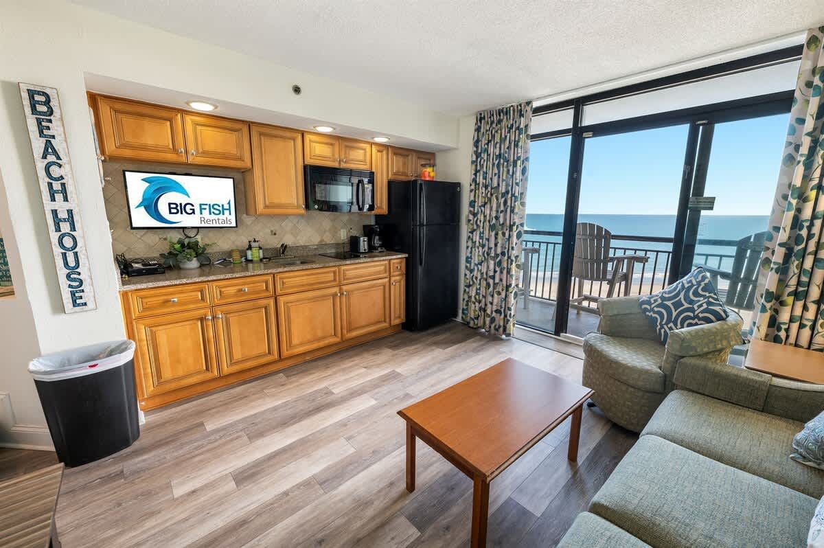 Once you enter through a foyer, Private bathroom, and bedroom to the left. Proceeding down the hallway opens up to the oceanfront main room, containing the sofa, kitchen table, and cooking area which all overlook the direct view of the ocean. Amazing ocean views from the balcony and living area (and bedroom) are the perfect setting for your morning coffee or evening cocktails. Enjoy the convenience of your own kitchen in this condo featuring a full-sized fridge, stove, and microwave.
