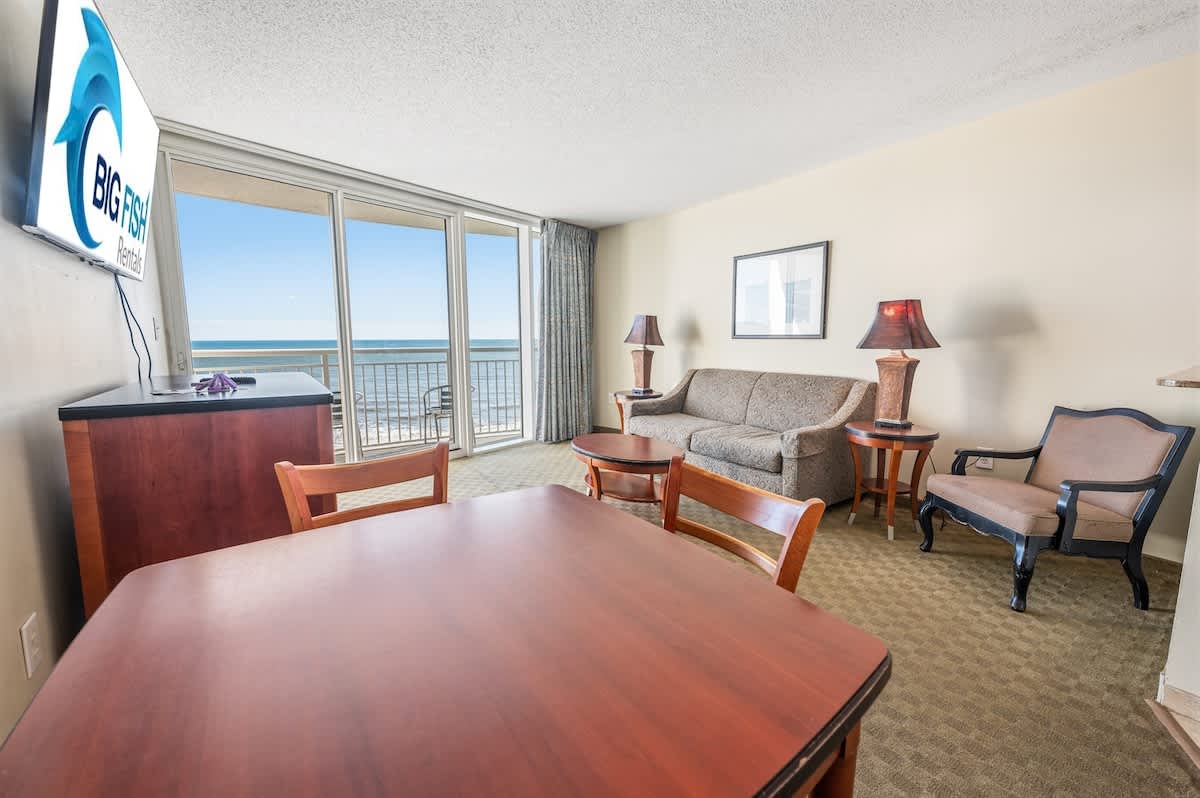 Modern, relaxing, wood furnishings adorn this 1 bedroom 1 bath suite towering above the Atlantic Ocean. Located next to Family Kingdom Amusement Park and Splashes Water Park, sit back and watch fireworks fly from your oceanfront balcony with pier views.